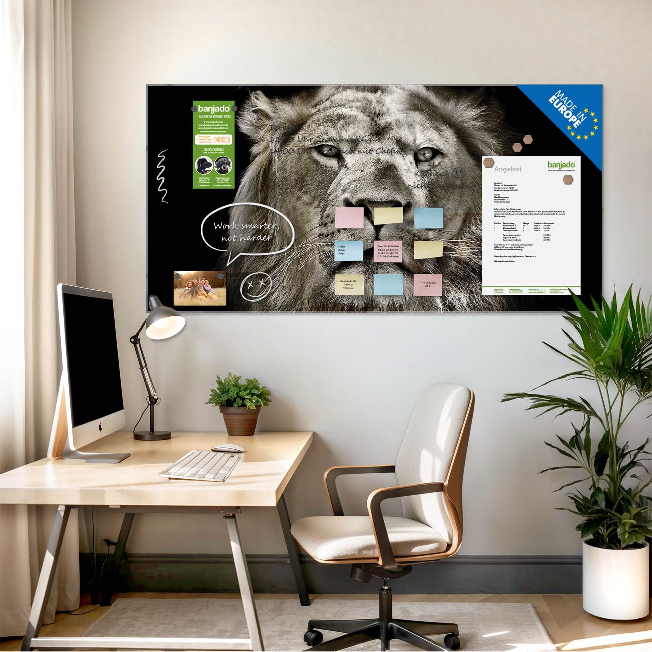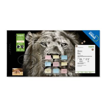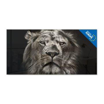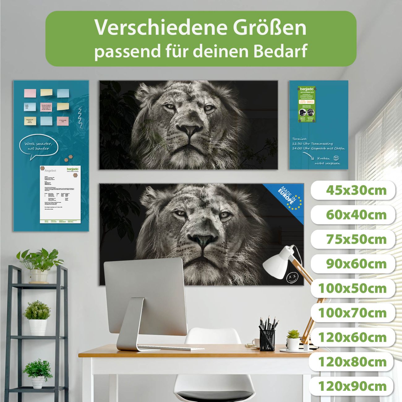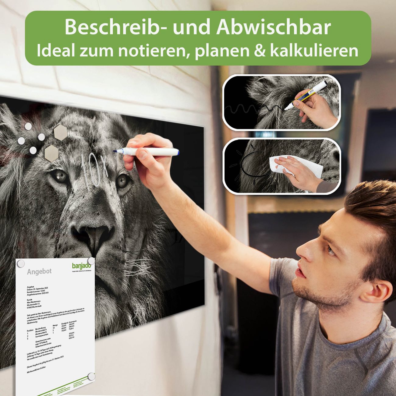 Material: 4mm Sicherheitsglas mit Metallrückwand Eigenschaften: beschreibbar, magnetisch, kratzfest Maße: 120x60x0,6cm, 10,80kg schwer Motiv Nummer 12968 Löwe Porträt Zubehör: inklusive 4 Neodym-Magnete