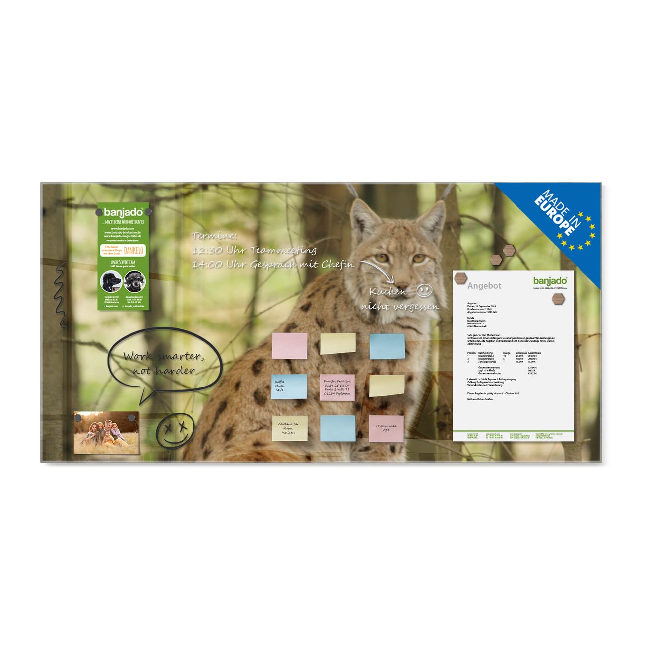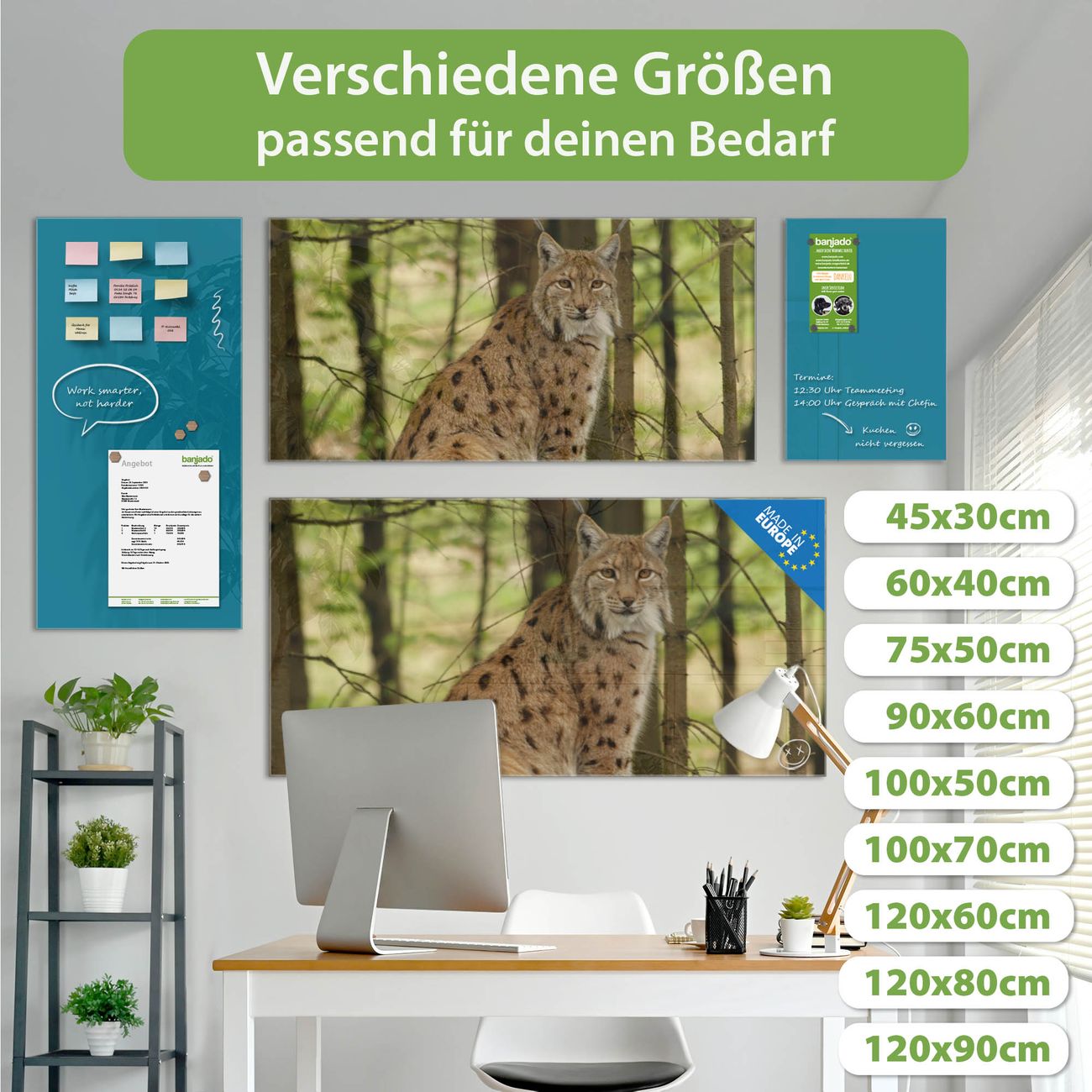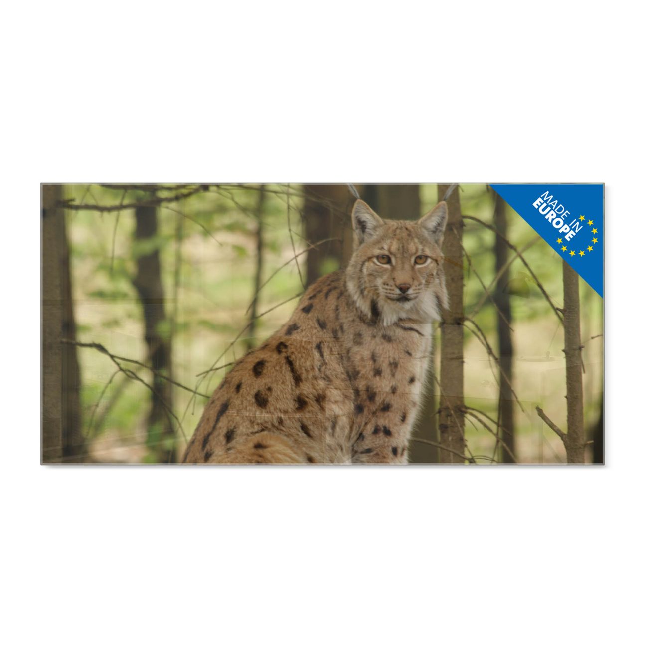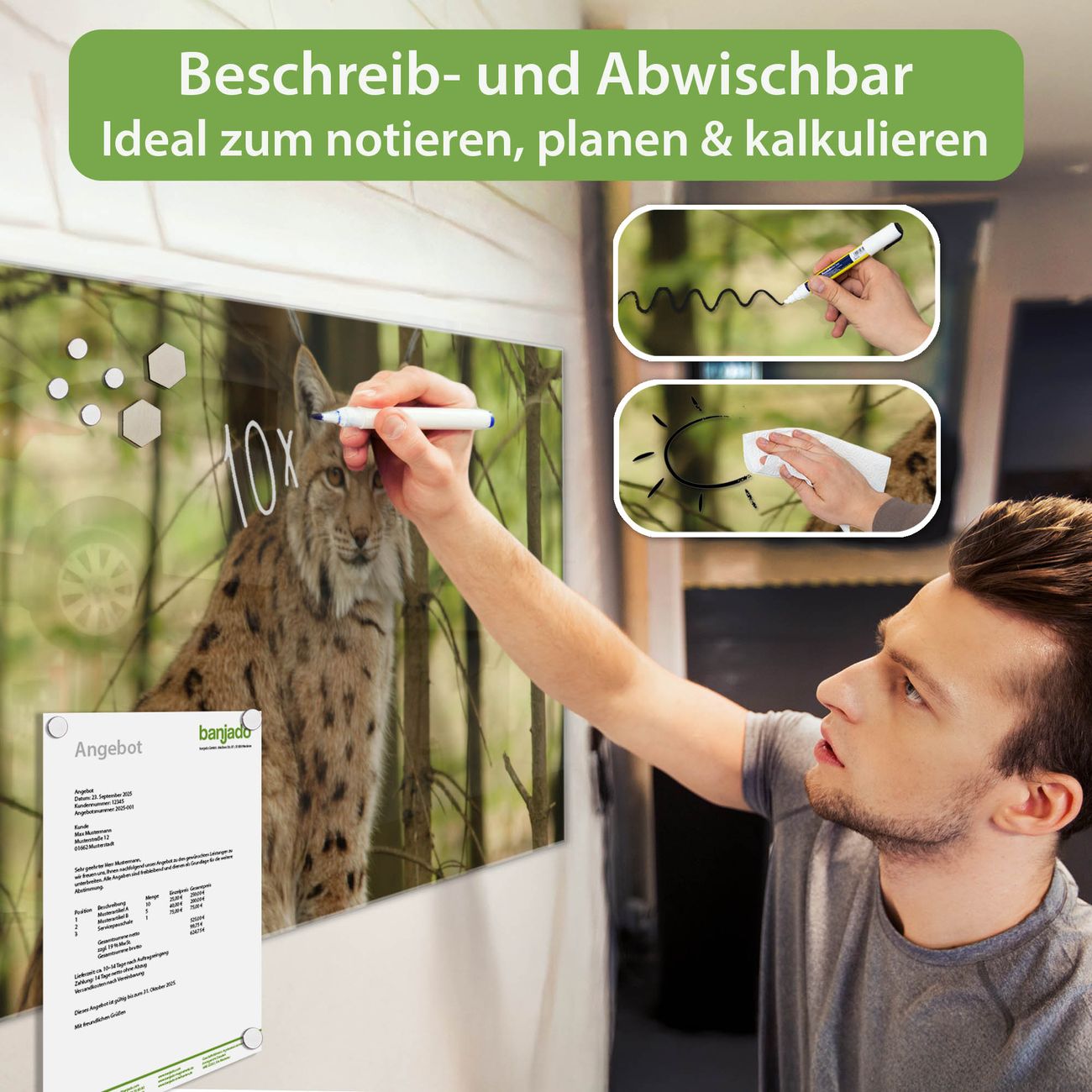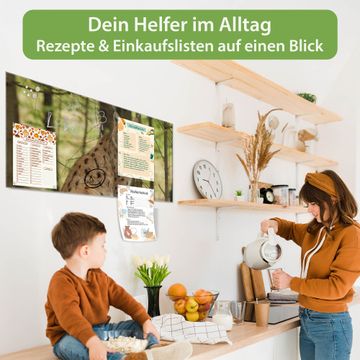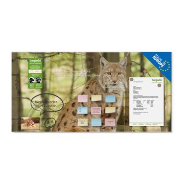 Material: 4mm Sicherheitsglas mit Metallrückwand Eigenschaften: beschreibbar, magnetisch, kratzfest Maße: 120x60x0,6cm, 10,80kg schwer Motiv Nummer 10487 Luchs Zubehör: inklusive 4 Neodym-Magnete