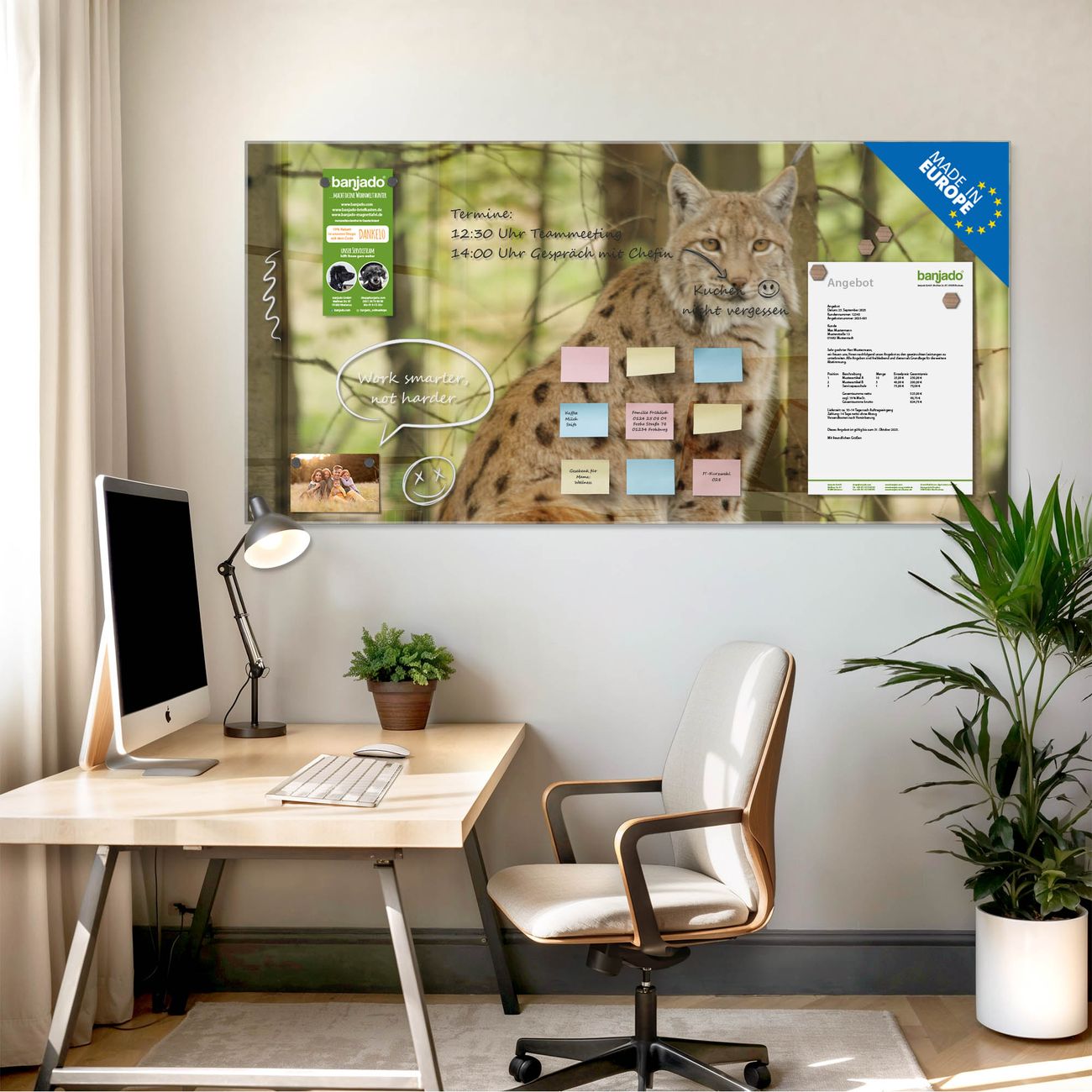 Jede Glas Magnettafel wird in unserer Werkstatt von Hand gefertigt und sorgfältig geprüft. So erhalten Sie ein echtes Qualitätsprodukt, das Funktion und Ästhetik perfekt vereint.?? Warum banjado?