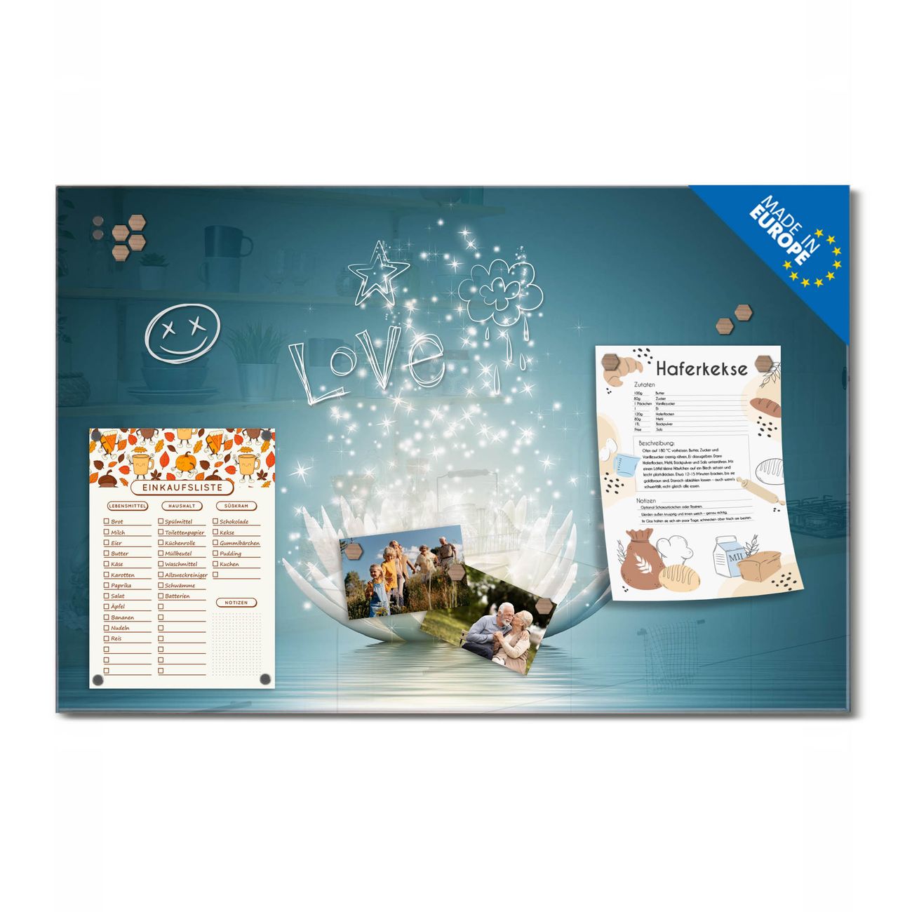 Material: 4mm Sicherheitsglas mit Metallrückwand Eigenschaften: beschreibbar, magnetisch, kratzfest Maße: 75x50x0,6cm, 5,63kg schwer Motiv Nummer 10630 Magische Lotusblüte Zubehör: inklusive 4 Neodym-Magnete