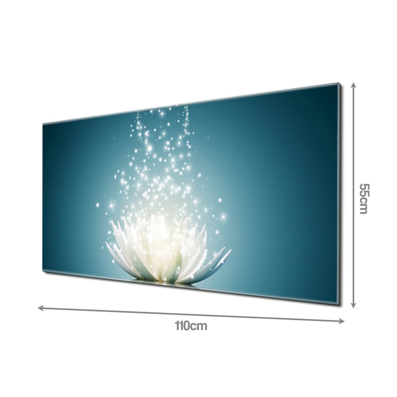 Material: 4mm Sicherheitsglas mit Metallrückwand Eigenschaften: beschreibbar, magnetisch, kratzfest Maße: 110x55x0,6cm, 9,08kg schwer Motiv Nummer 10630 Magische Lotusblüte Zubehör: inklusive 4 Neodym-Magnete