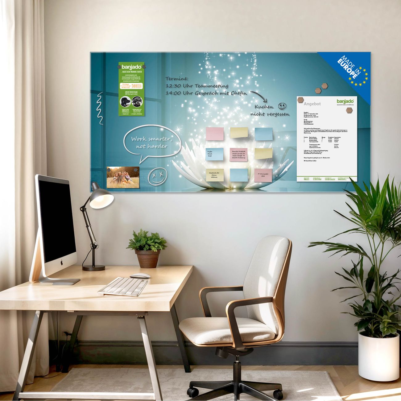 Die banjado Glas Magnettafel mit dem Motiv Motiv Magische Lotusblüte verbindet Funktionalität mit Stil. Sie ersetzt das Zettelchaos durch klare Strukturen und bringt dabei eine warme, natürliche Atmosphäre in Ihr Zuhause. Ob im Büro, in der Küche oder im Eingangsbereich - dieses Design-Board zieht Blicke an und sorgt für Ordnung mit Charakter.