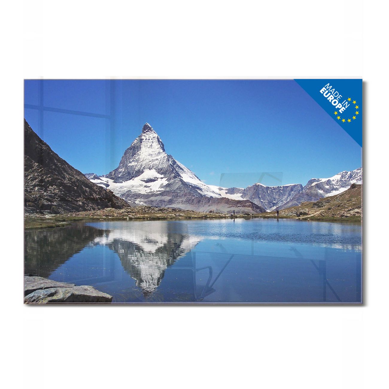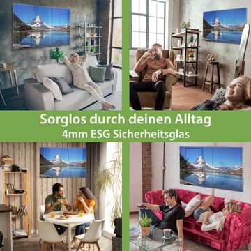 Material: 4mm Sicherheitsglas mit Metallrückwand Eigenschaften: beschreibbar, magnetisch, kratzfest Maße: 90x60x0,6cm, 8,10kg schwer Motiv Nummer 10411 Matterhorn Zubehör: inklusive 4 Neodym-Magnete