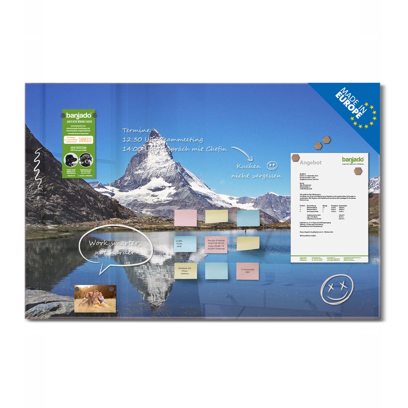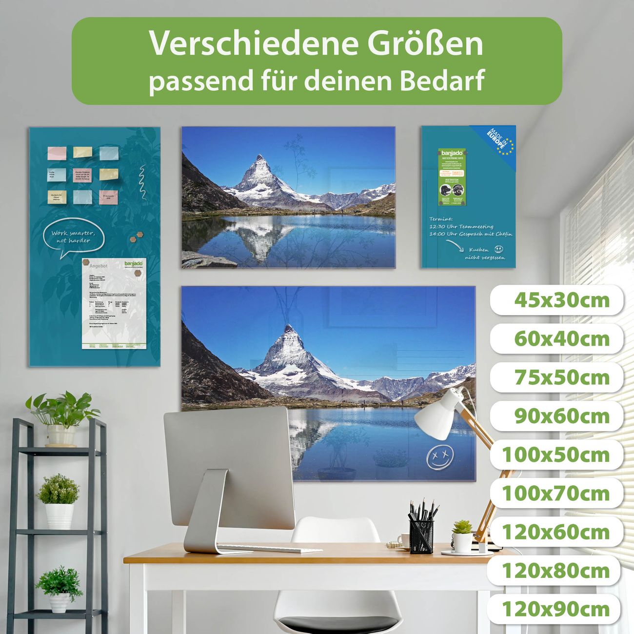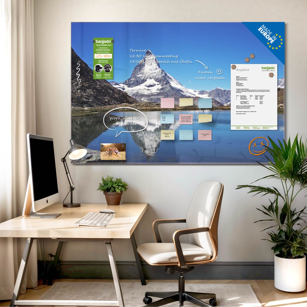 Jede Glas Magnettafel wird in unserer Werkstatt von Hand gefertigt und sorgfältig geprüft. So erhalten Sie ein echtes Qualitätsprodukt, das Funktion und Ästhetik perfekt vereint.?? Warum banjado?