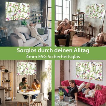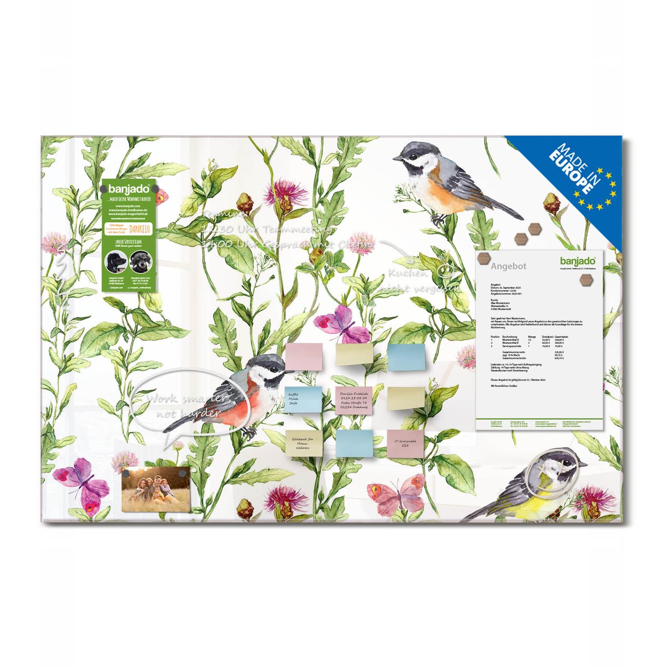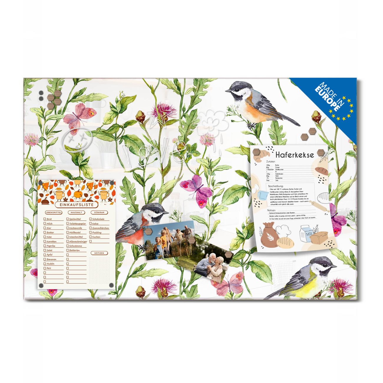 Material: 4mm Sicherheitsglas mit Metallrückwand Eigenschaften: beschreibbar, magnetisch, kratzfest Maße: 120x80x0,6cm, 14,40kg schwer Motiv Nummer 11138 Meisen im Klee Zubehör: inklusive 4 Neodym-Magnete