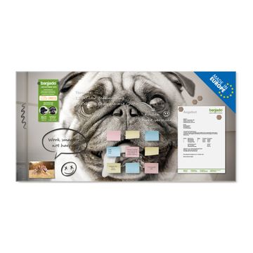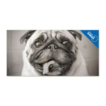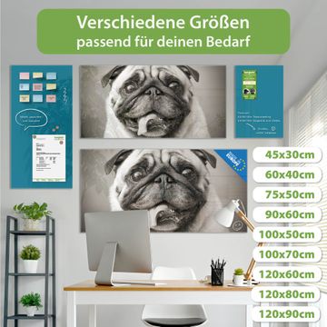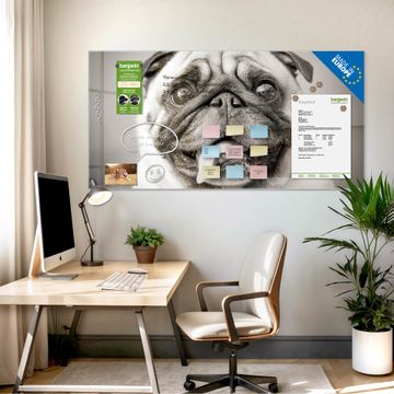 Material: 4mm Sicherheitsglas mit Metallrückwand Eigenschaften: beschreibbar, magnetisch, kratzfest Maße: 120x60x0,6cm, 10,80kg schwer Motiv Nummer 12903 Mops Porträt Zubehör: inklusive 4 Neodym-Magnete