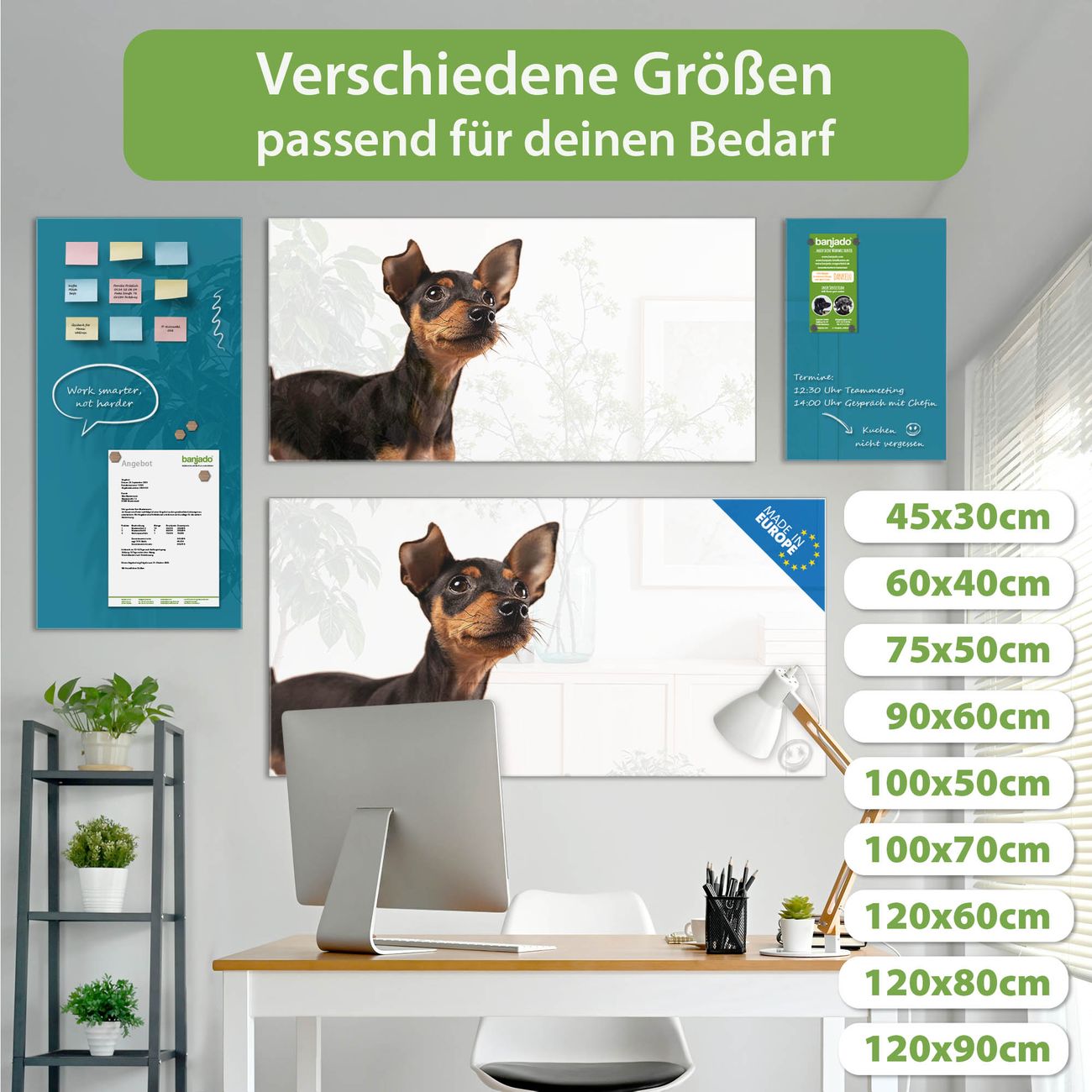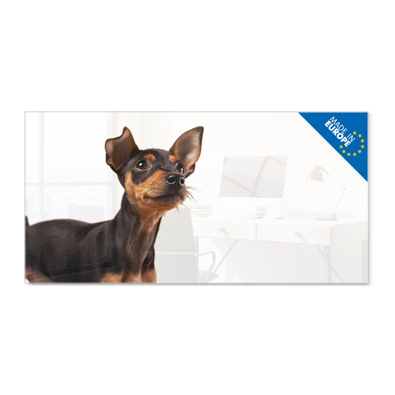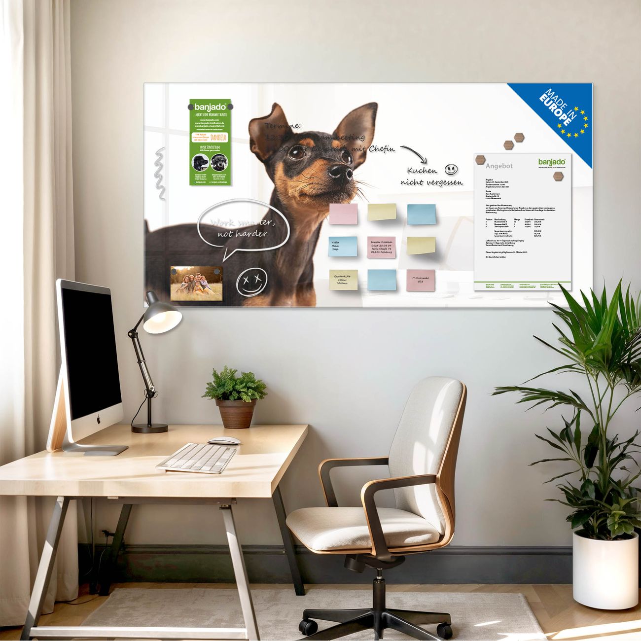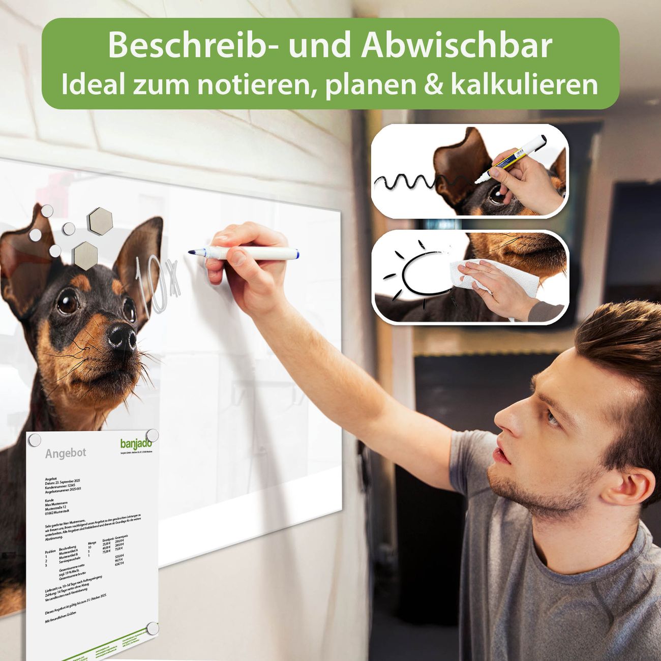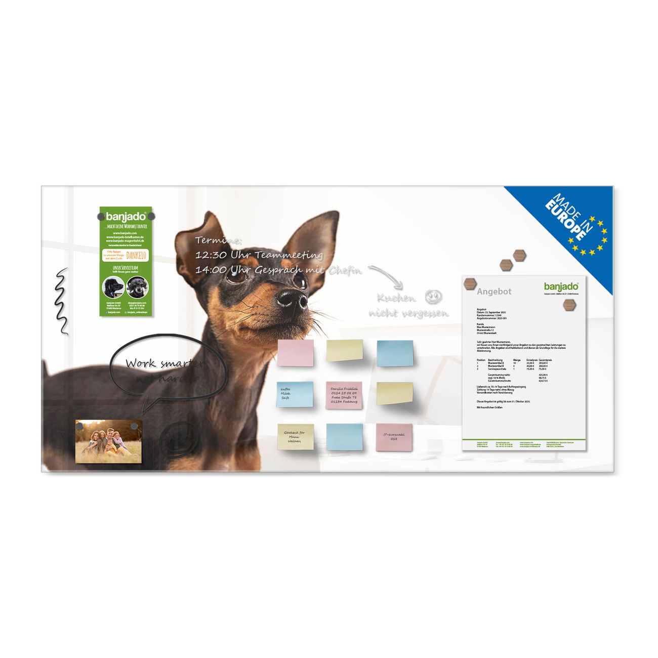 Material: 4mm Sicherheitsglas mit Metallrückwand Eigenschaften: beschreibbar, magnetisch, kratzfest Maße: 100x50x0,6cm, 7,50kg schwer Motiv Nummer 13420 Niedlicher Welpe Zubehör: inklusive 4 Neodym-Magnete