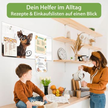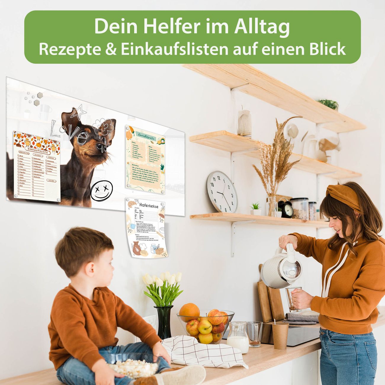 Auf der glatten Glasoberfläche lassen sich Termine, Rezepte oder Notizen ganz einfach mit Kreidestiften festhalten und rückstandslos entfernen. Starke Neodym-Magnete halten Ihre wichtigsten Erinnerungen sicher an Ort und Stelle. So entsteht Ihre ganz persönliche Ideenwand - jeden Tag neu.