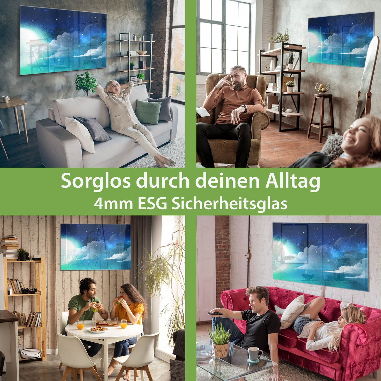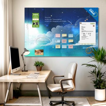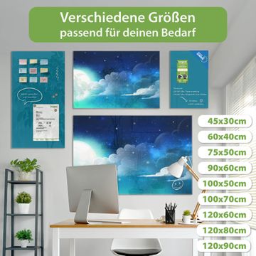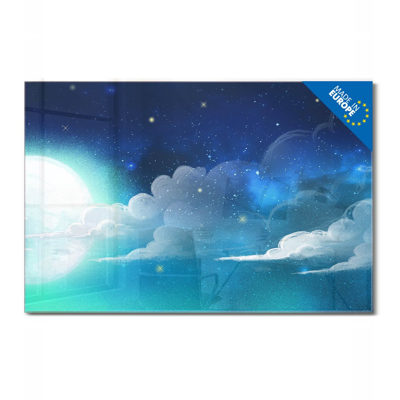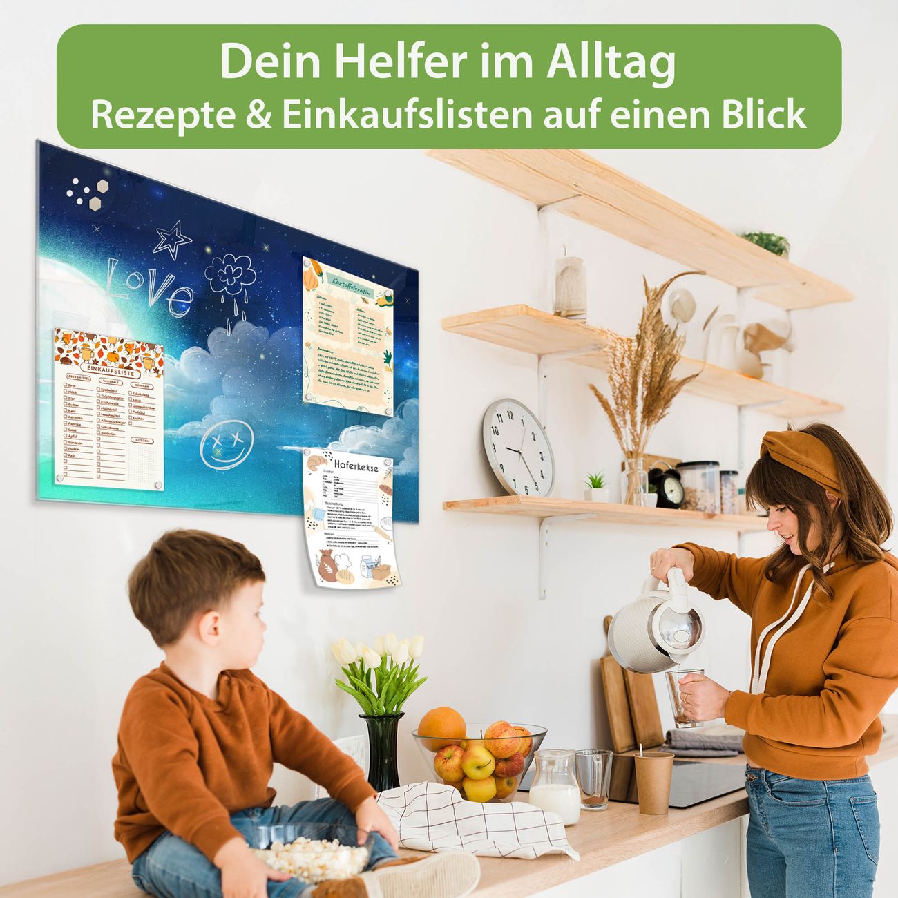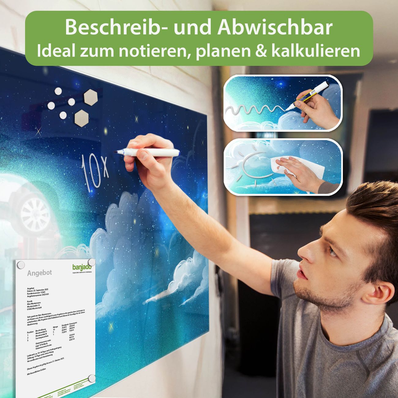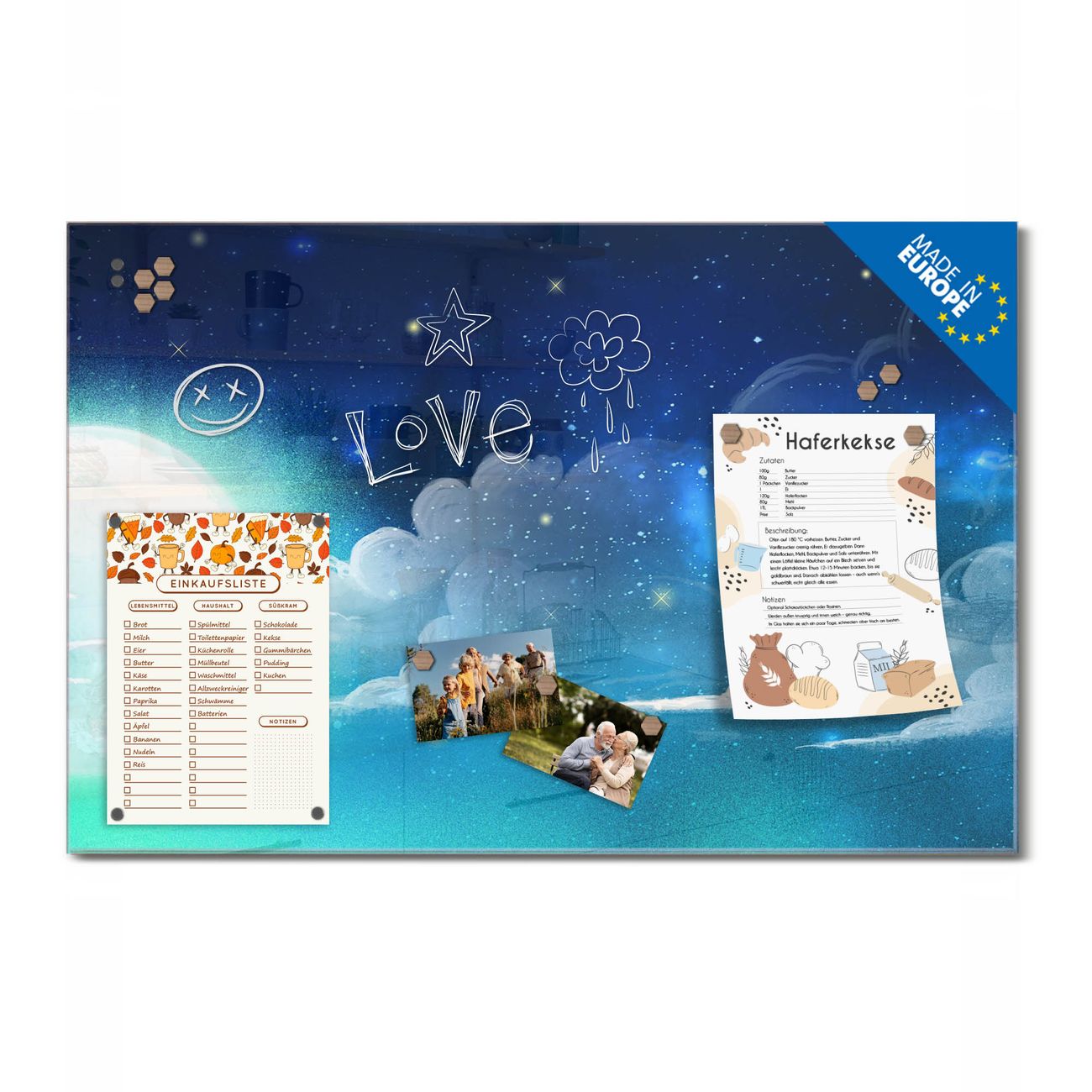 Material: 4mm Sicherheitsglas mit Metallrückwand Eigenschaften: beschreibbar, magnetisch, kratzfest Maße: 45x30x0,6cm, 2,03kg schwer Motiv Nummer 12842 Nachthimmel 1 Zubehör: inklusive 4 Neodym-Magnete