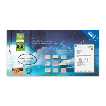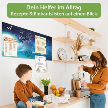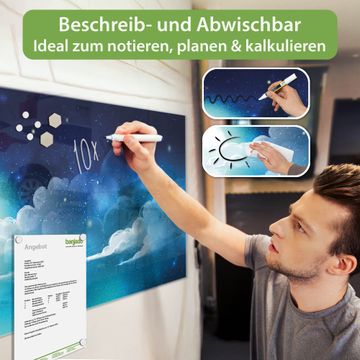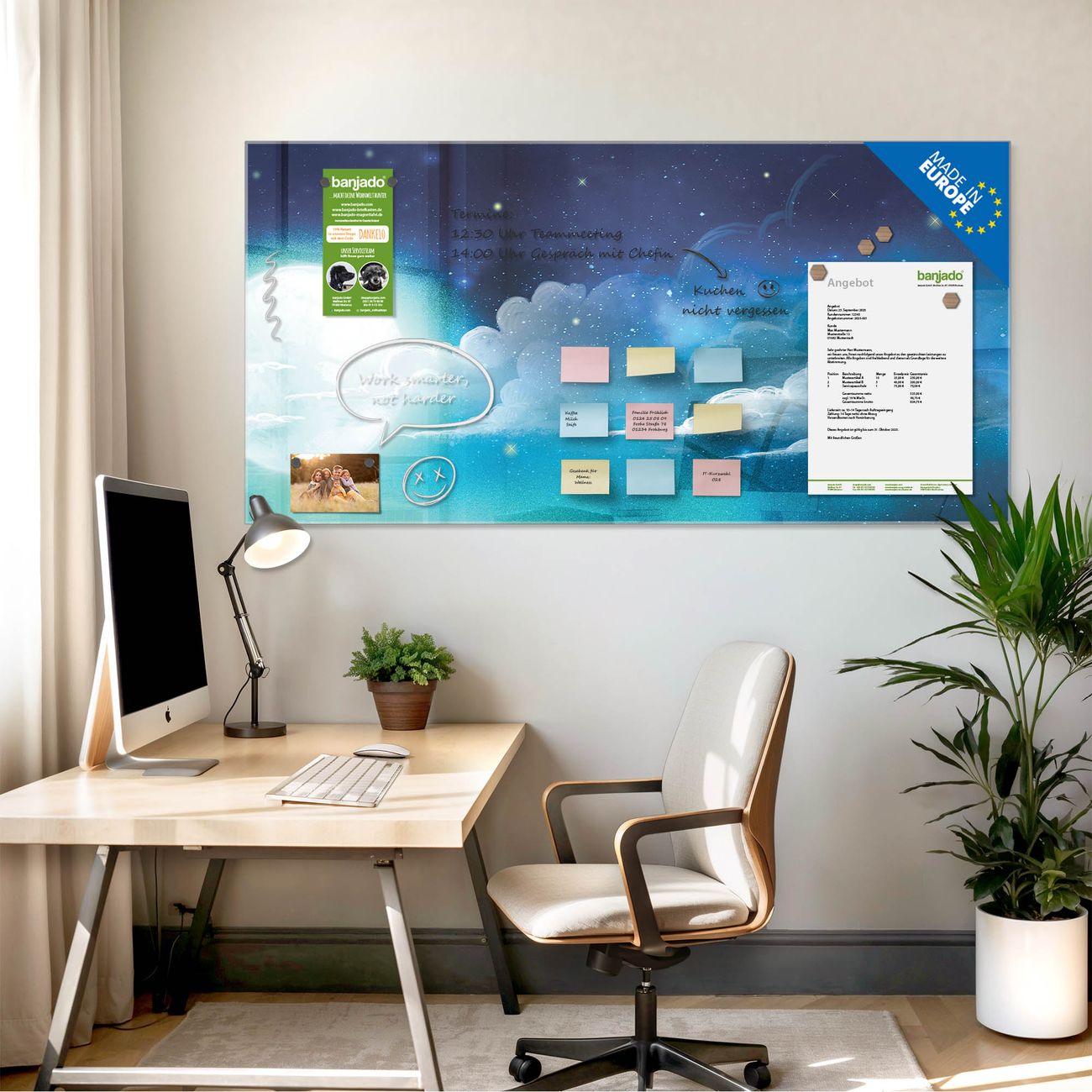 Material: 4mm Sicherheitsglas mit Metallrückwand Eigenschaften: beschreibbar, magnetisch, kratzfest Maße: 100x50x0,6cm, 7,50kg schwer Motiv Nummer 12842 Nachthimmel 1 Zubehör: inklusive 4 Neodym-Magnete