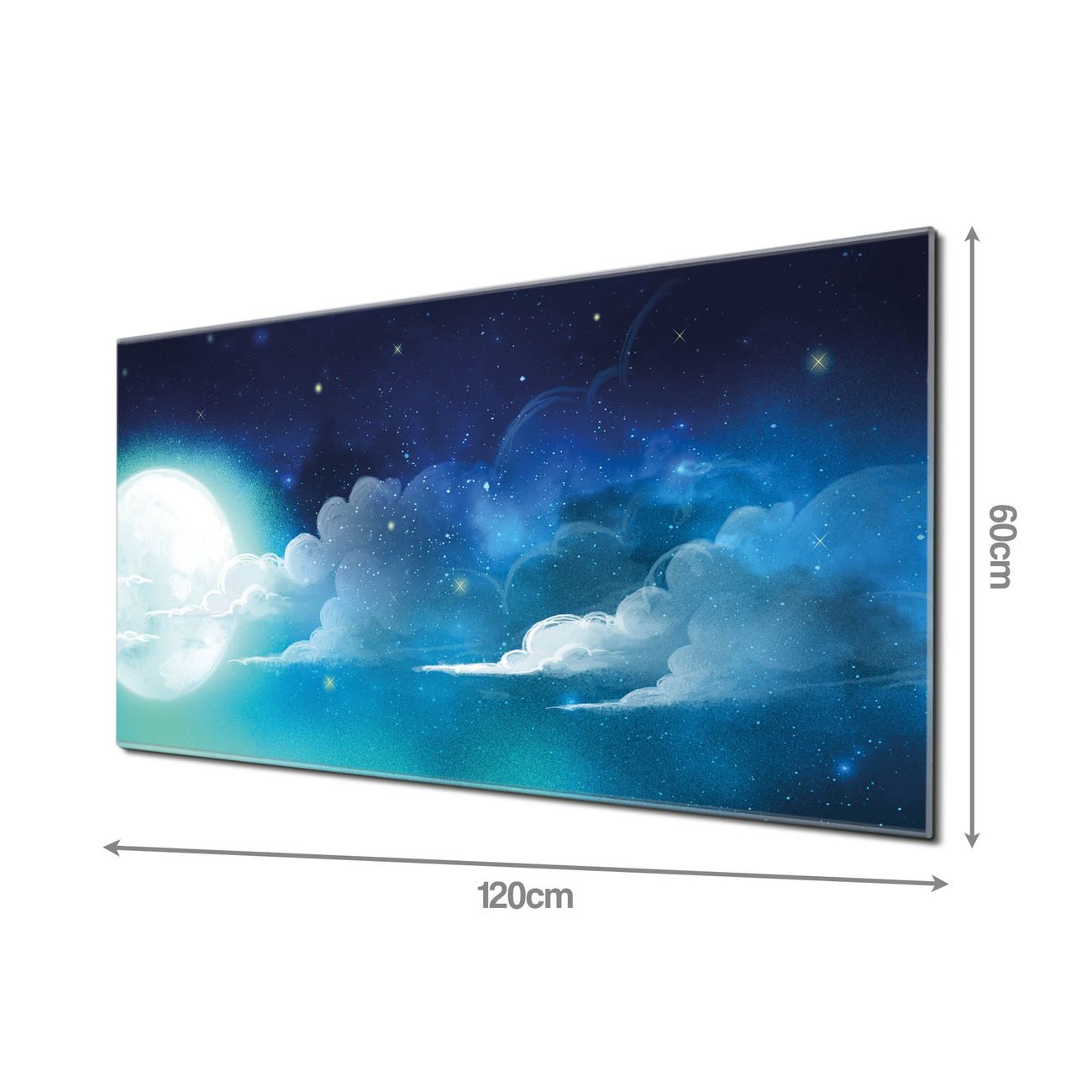 Material: 4mm Sicherheitsglas mit Metallrückwand Eigenschaften: beschreibbar, magnetisch, kratzfest Maße: 120x60x0,6cm, 10,80kg schwer Motiv Nummer 12842 Nachthimmel 1 Zubehör: inklusive 4 Neodym-Magnete