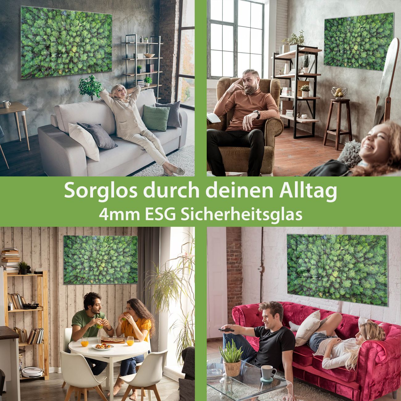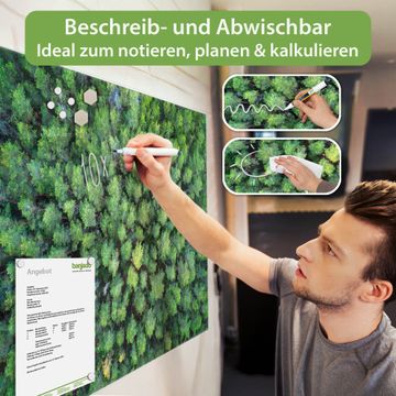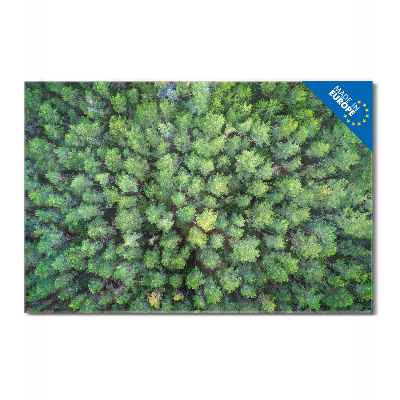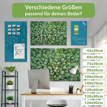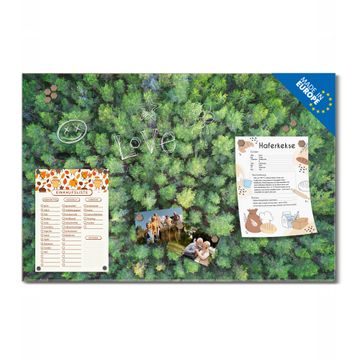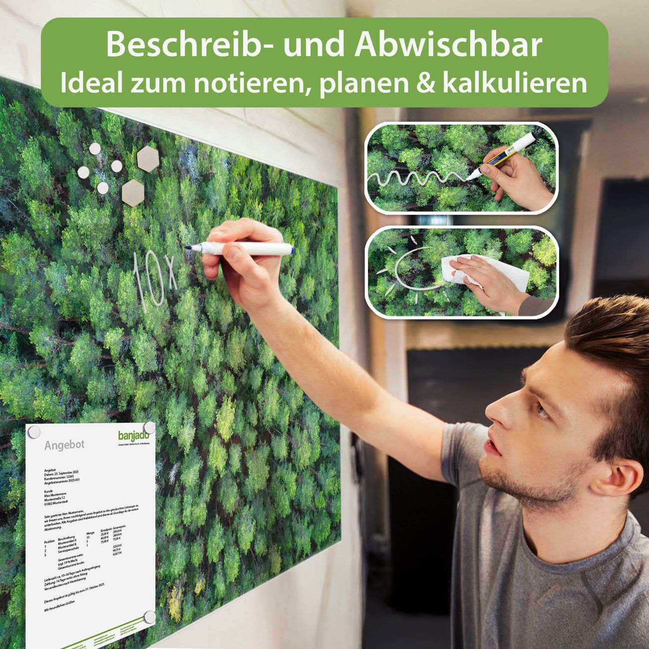 Material: 4mm Sicherheitsglas mit Metallrückwand Eigenschaften: beschreibbar, magnetisch, kratzfest Maße: 75x50x0,6cm, 5,63kg schwer Motiv Nummer 12872 Nadelwald Zubehör: inklusive 4 Neodym-Magnete