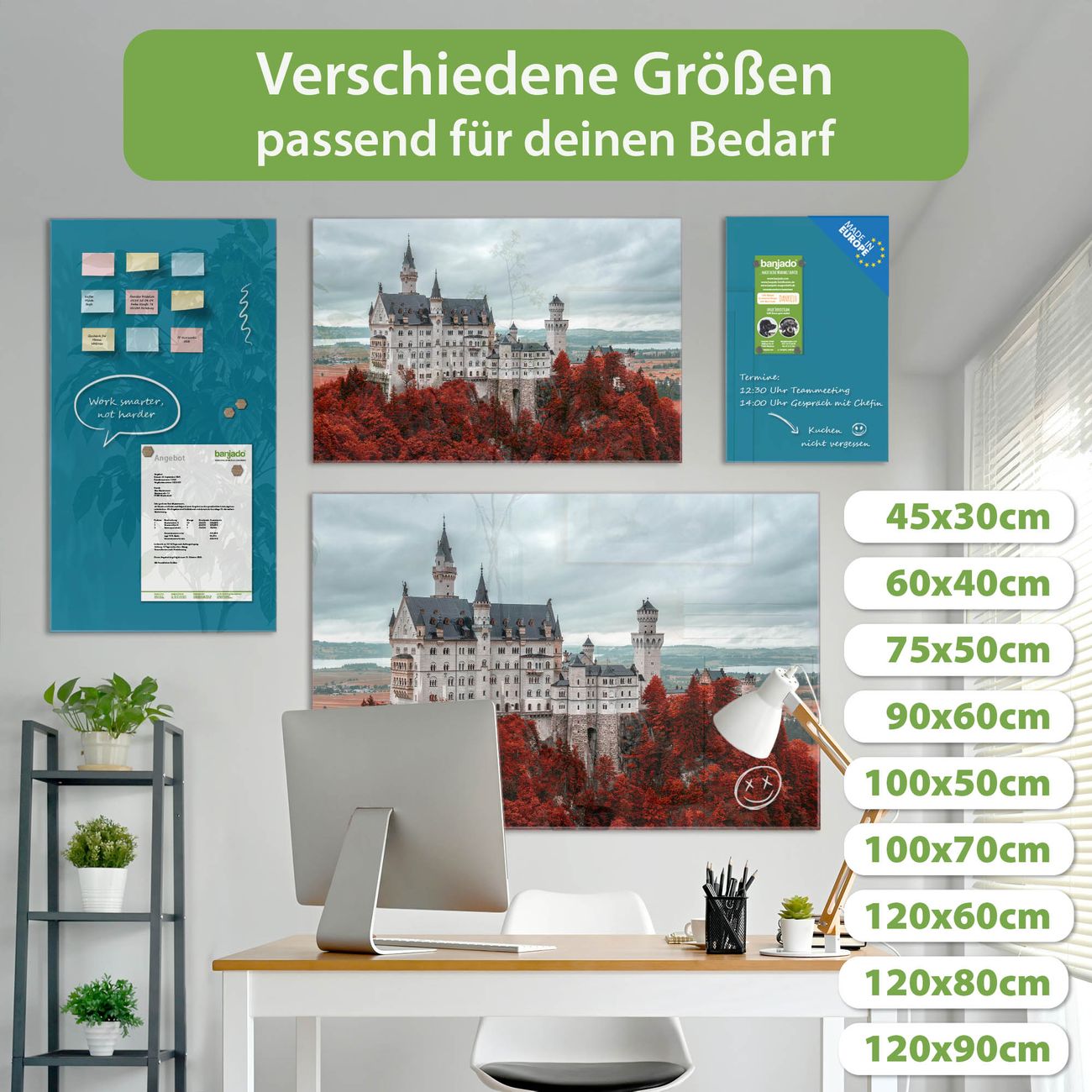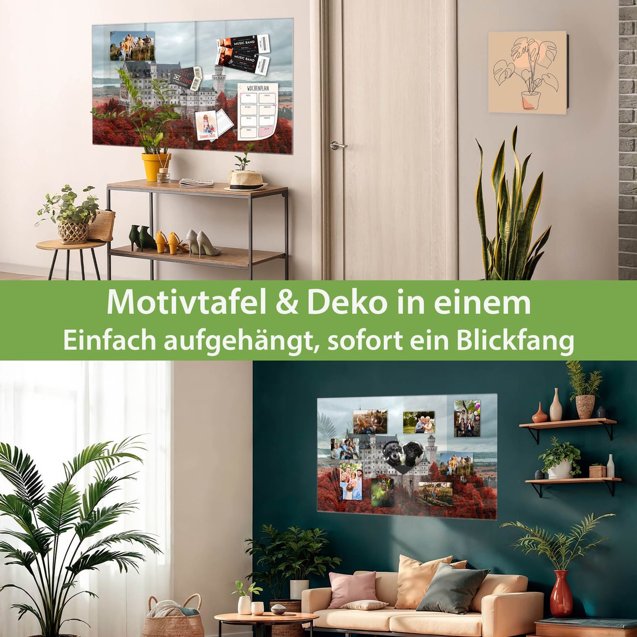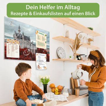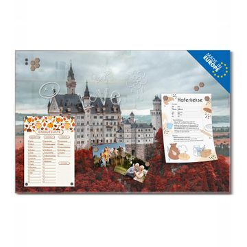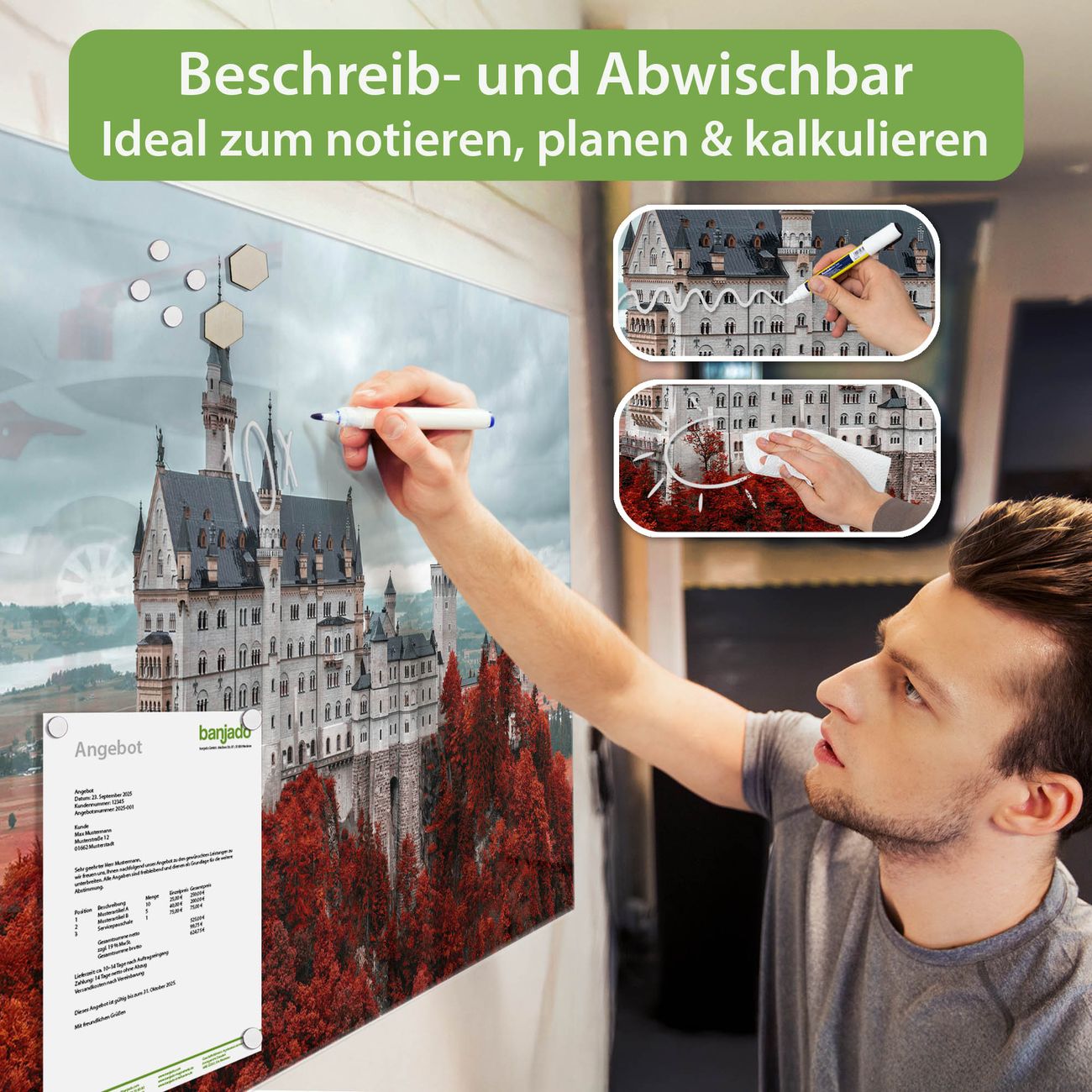 Material: 4mm Sicherheitsglas mit Metallrückwand Eigenschaften: beschreibbar, magnetisch, kratzfest Maße: 75x50x0,6cm, 5,63kg schwer Motiv Nummer 12940 Neuschwanstein Zubehör: inklusive 4 Neodym-Magnete