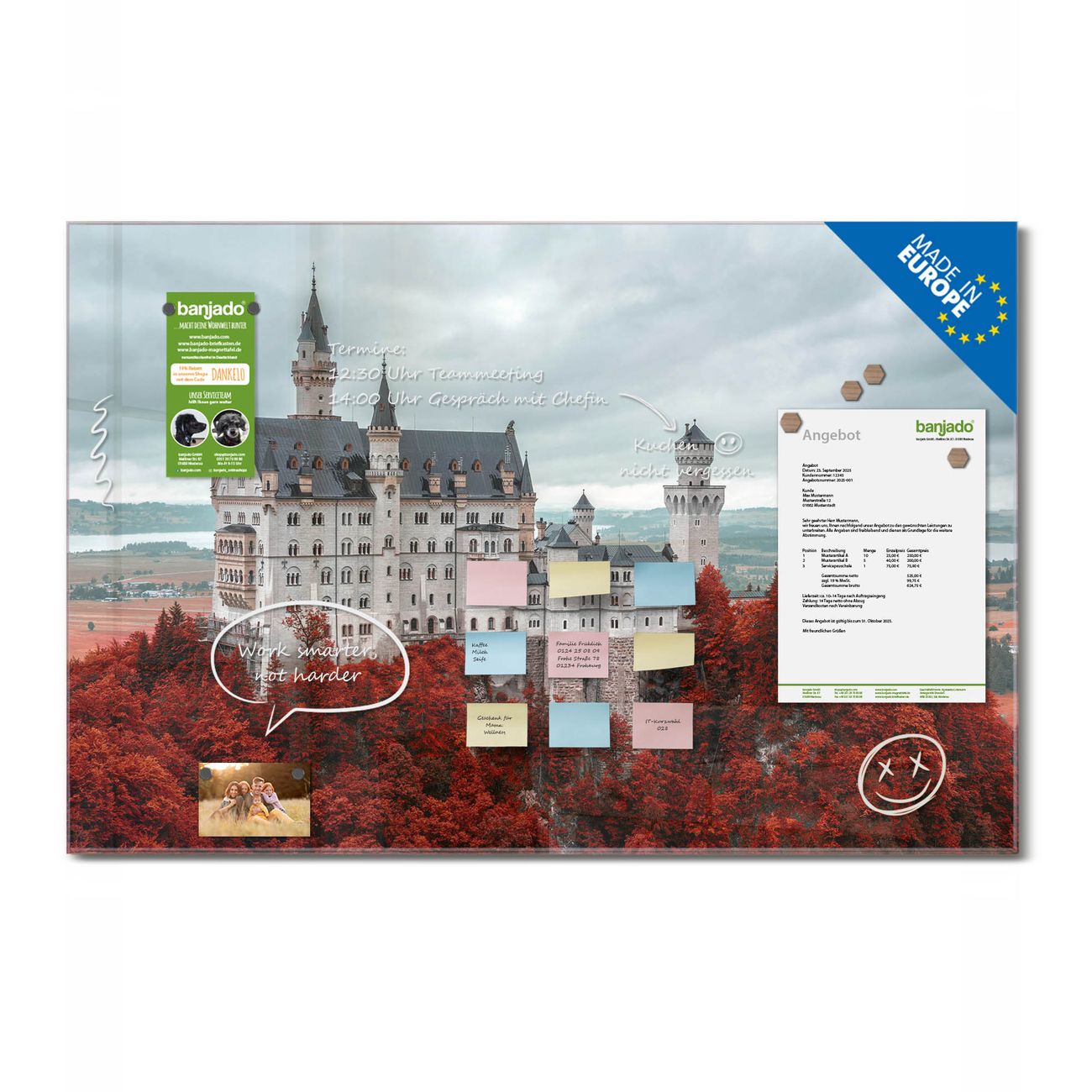 Material: 4mm Sicherheitsglas mit Metallrückwand Eigenschaften: beschreibbar, magnetisch, kratzfest Maße: 120x80x0,6cm, 14,40kg schwer Motiv Nummer 12940 Neuschwanstein Zubehör: inklusive 4 Neodym-Magnete