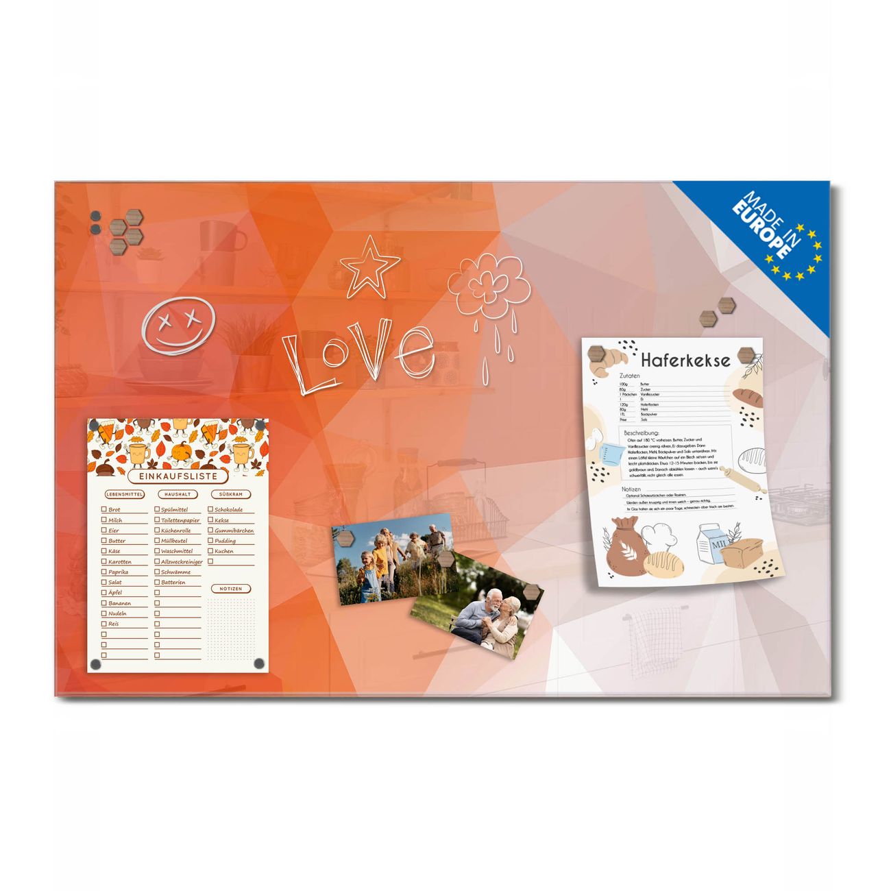 Material: 4mm Sicherheitsglas mit Metallrückwand Eigenschaften: beschreibbar, magnetisch, kratzfest Maße: 75x50x0,6cm, 5,63kg schwer Motiv Nummer 12952 Orange Polygon Zubehör: inklusive 4 Neodym-Magnete