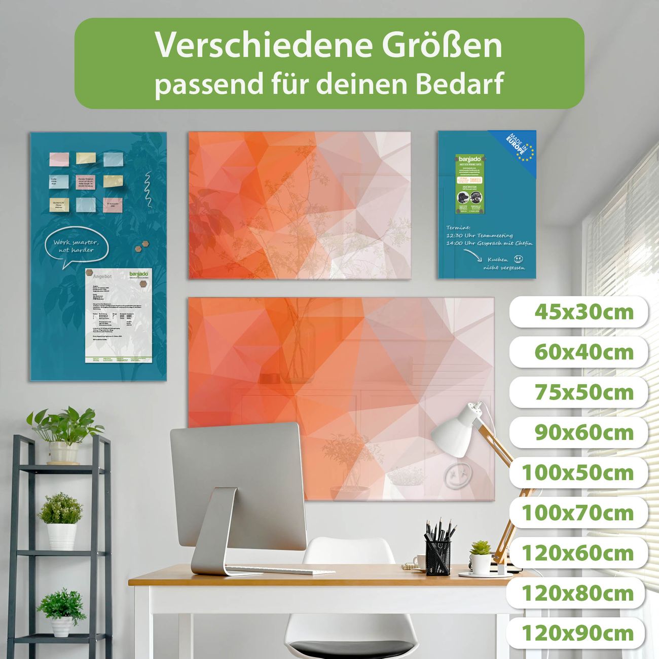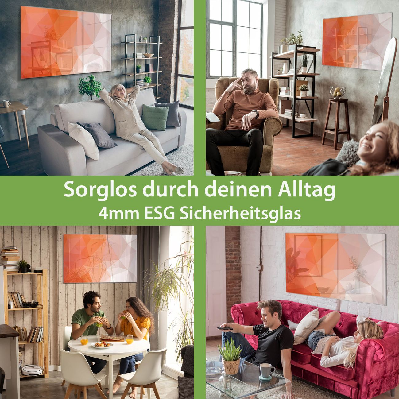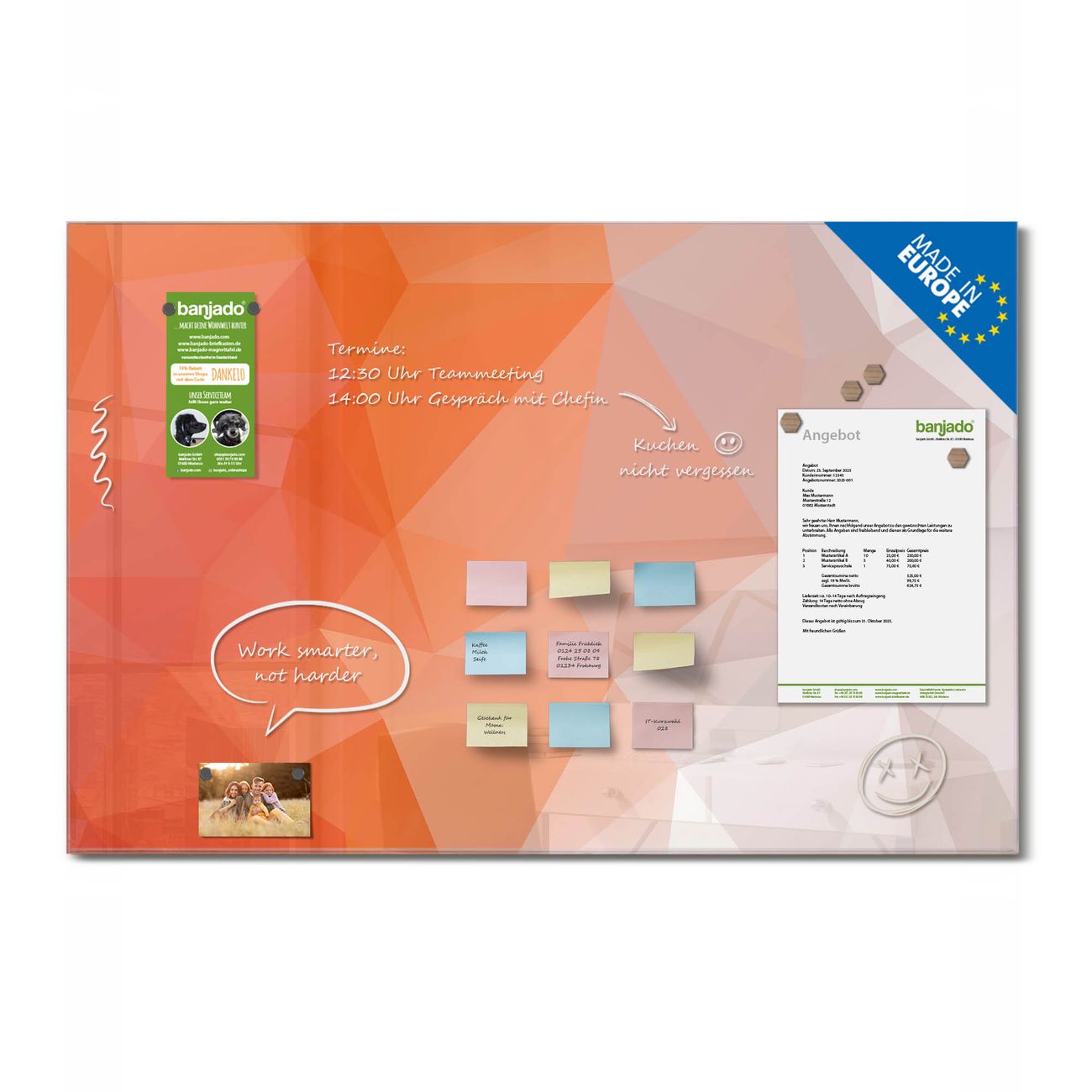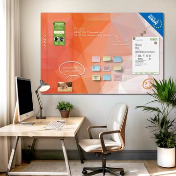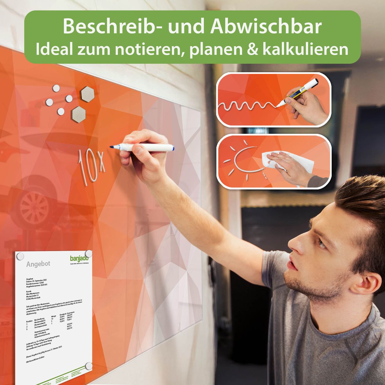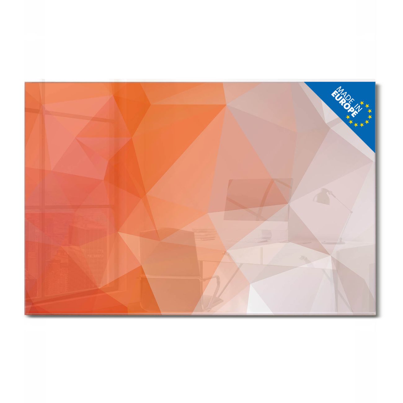 Material: 4mm Sicherheitsglas mit Metallrückwand Eigenschaften: beschreibbar, magnetisch, kratzfest Maße: 90x60x0,6cm, 8,10kg schwer Motiv Nummer 12952 Orange Polygon Zubehör: inklusive 4 Neodym-Magnete