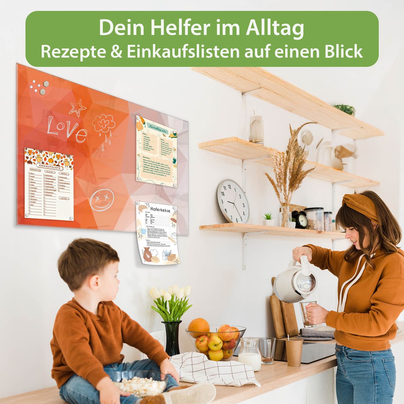 Ein Stück Design, das Ihren Alltag organisiert. Schreiben, heften, inspirieren - alles an einem Ort. Qualität, die man spürt. Montage leicht gemacht. Handwerk mit Herz - veredelt in Sachsen. Einzigartiges Design mit Motiv Motiv Orange Polygon Beschreibbare Glasoberfläche, leicht zu reinigen Starke Magnetkraft durch Stahlrückwand Inklusive 4 Neodym-Magneten Flexible Montageoptionen Handveredelt in Sachsen - Qualität, die bleibt