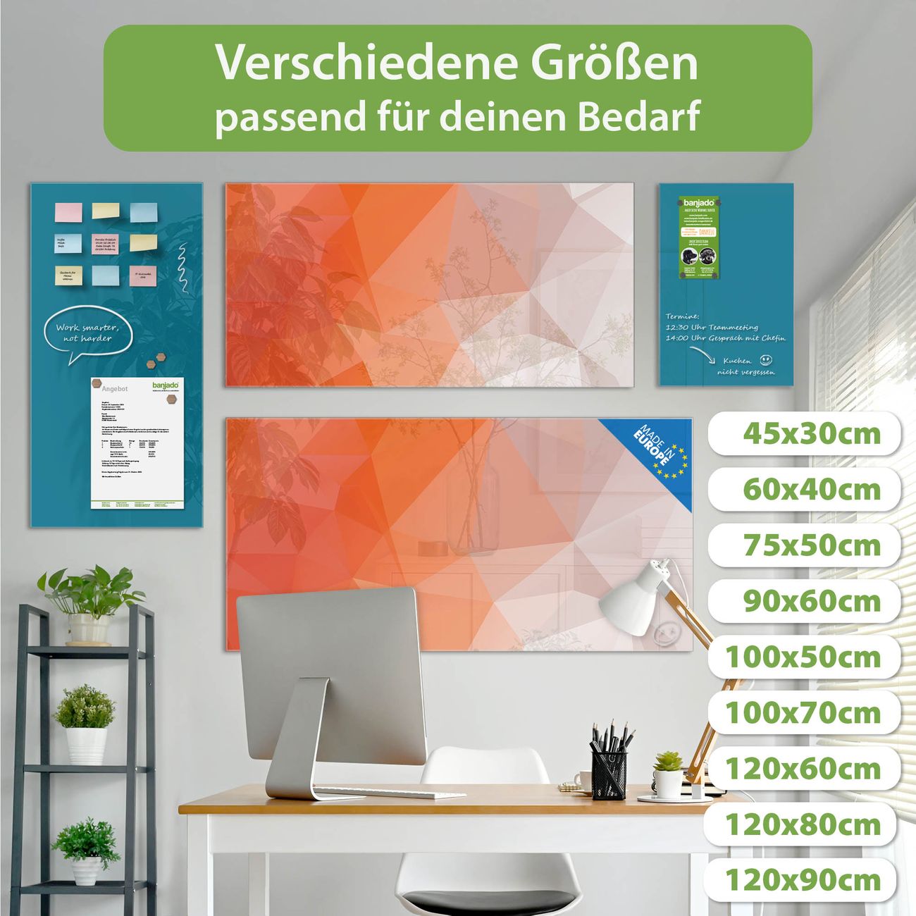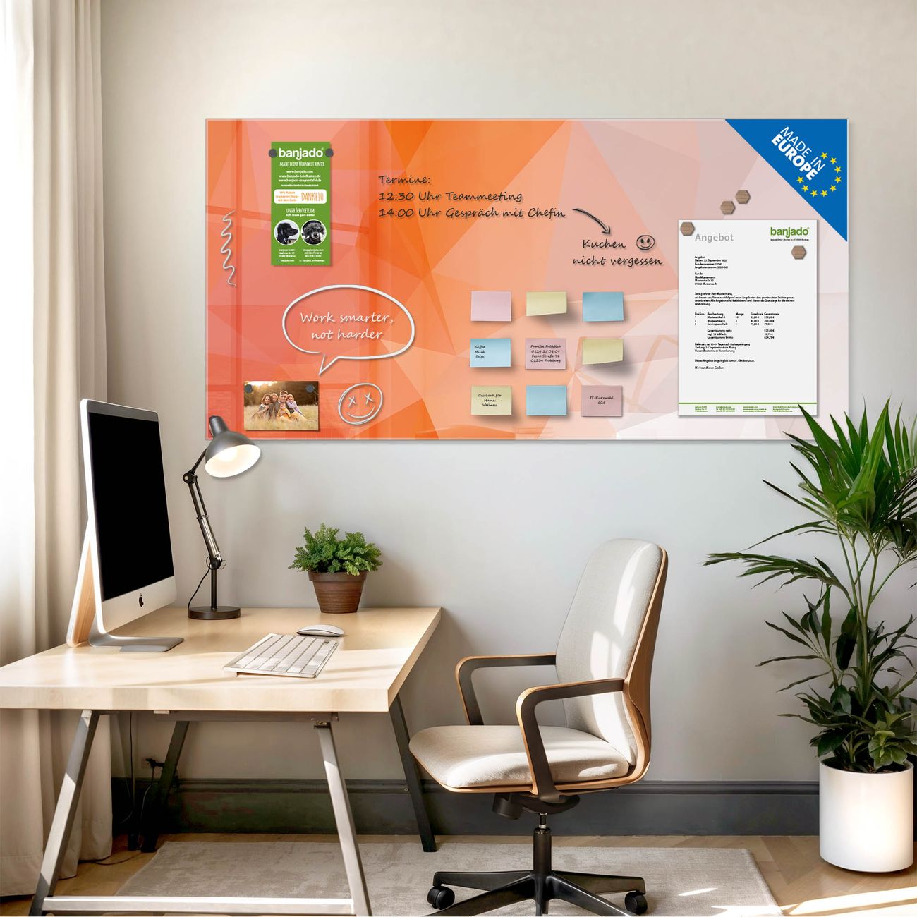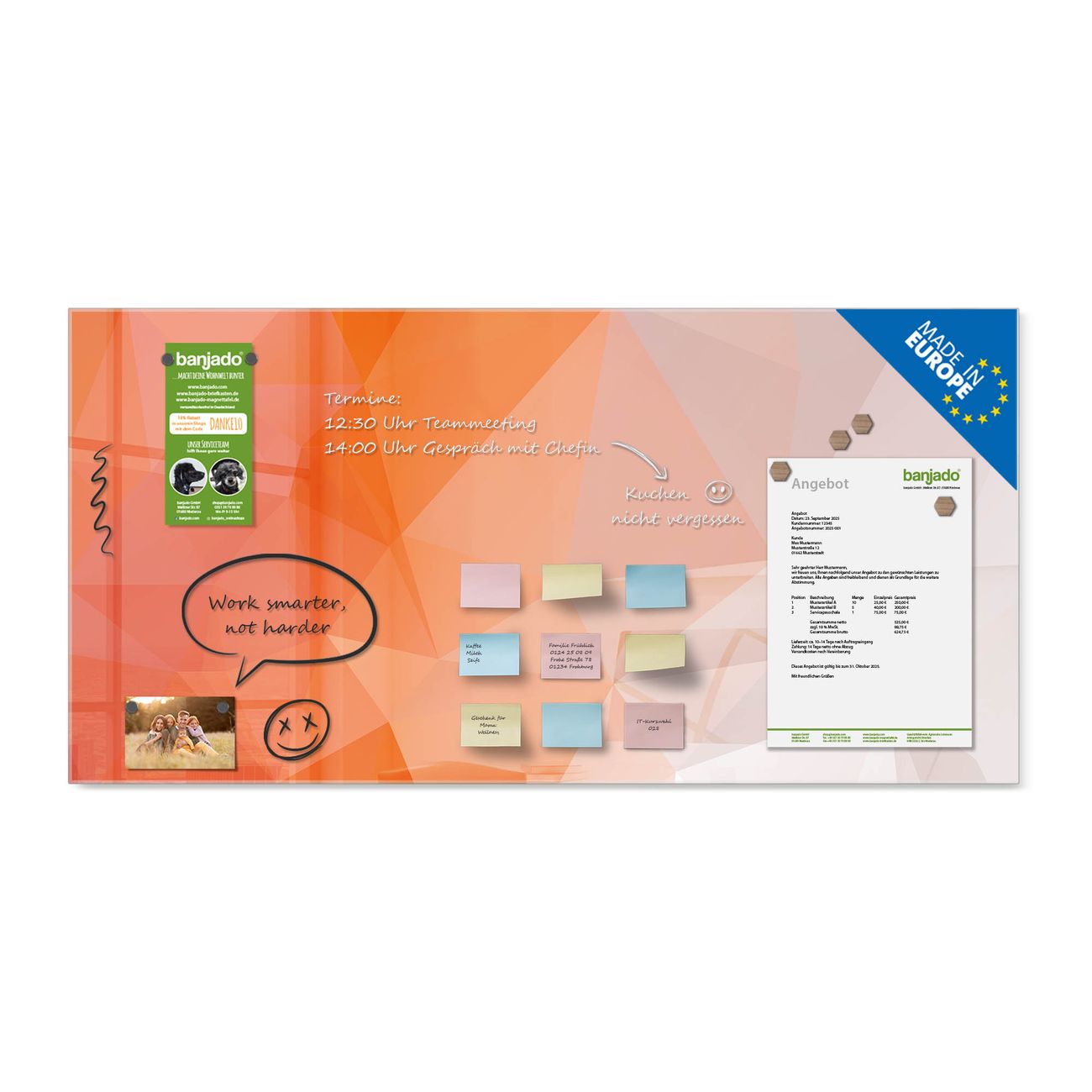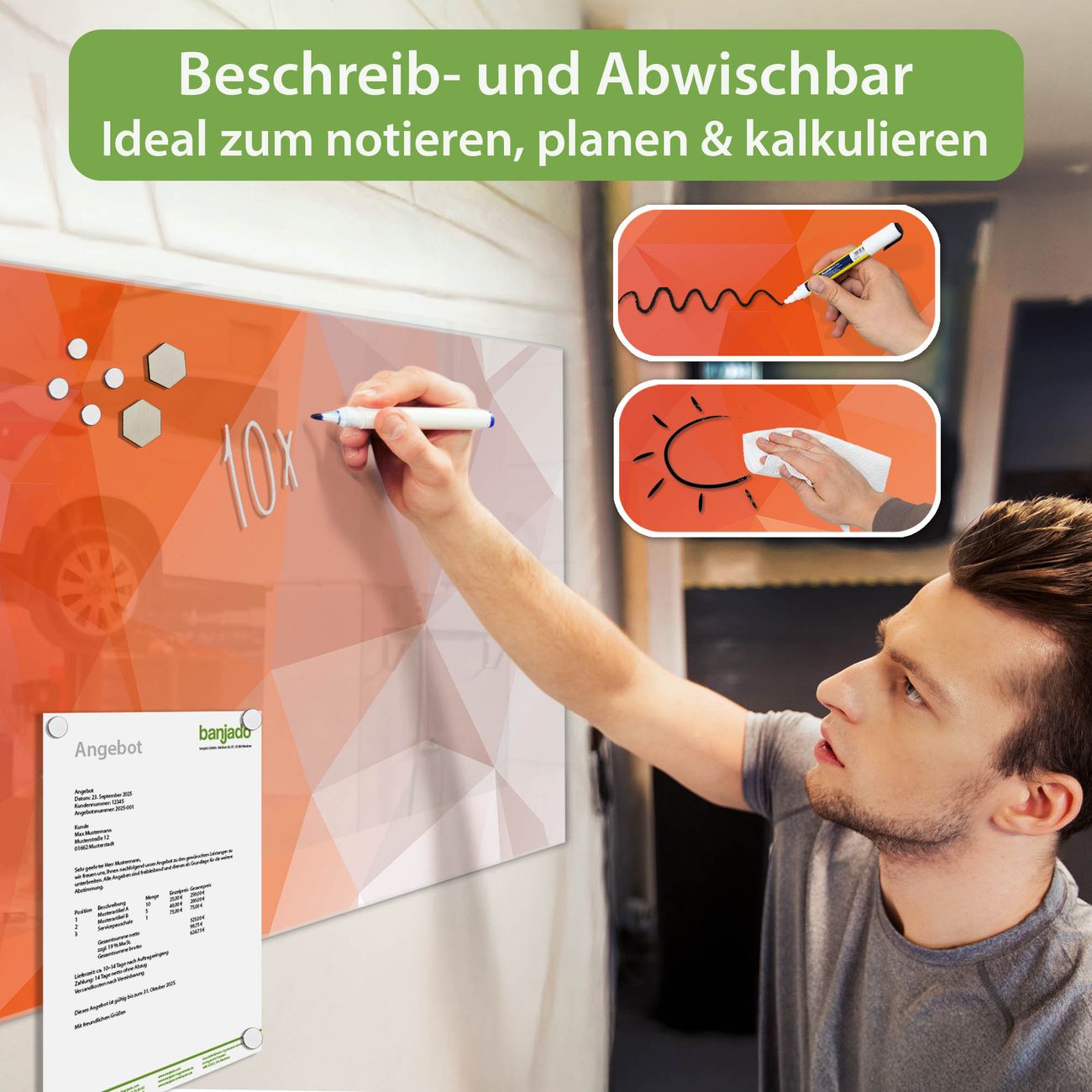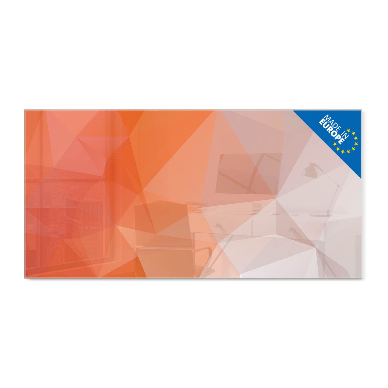 Material: 4mm Sicherheitsglas mit Metallrückwand Eigenschaften: beschreibbar, magnetisch, kratzfest Maße: 120x60x0,6cm, 10,80kg schwer Motiv Nummer 12952 Orange Polygon Zubehör: inklusive 4 Neodym-Magnete