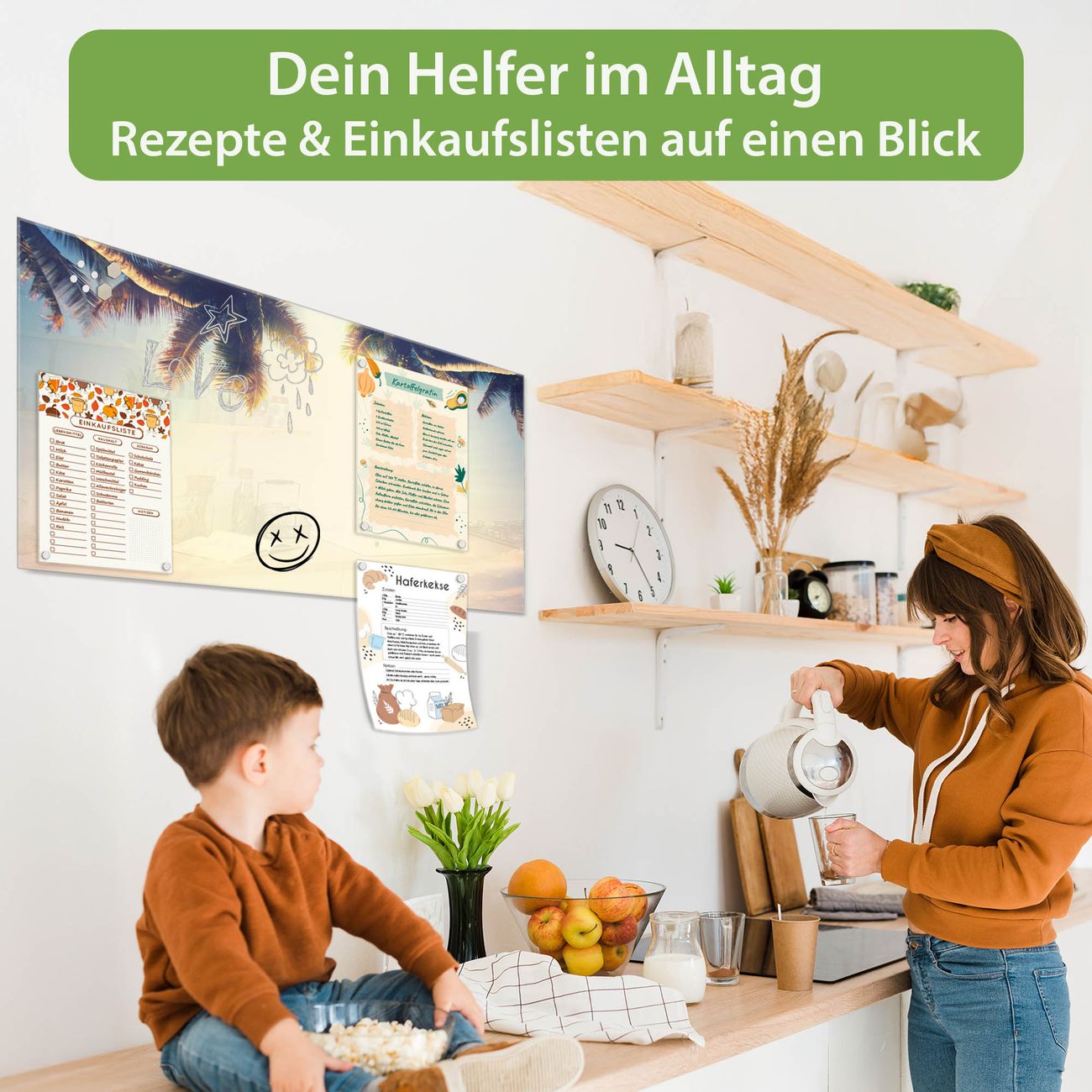 Auf der glatten Glasoberfläche lassen sich Termine, Rezepte oder Notizen ganz einfach mit Kreidestiften festhalten und rückstandslos entfernen. Starke Neodym-Magnete halten Ihre wichtigsten Erinnerungen sicher an Ort und Stelle. So entsteht Ihre ganz persönliche Ideenwand - jeden Tag neu.