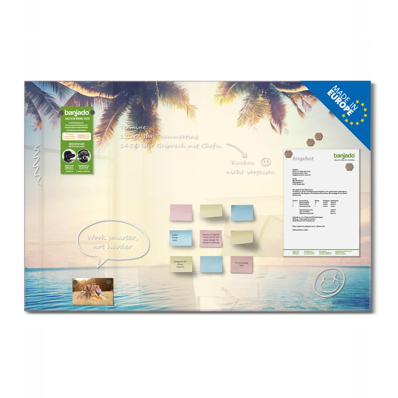 Die banjado Glas Magnettafel mit dem Motiv Motiv Paradis verbindet Funktionalität mit Stil. Sie ersetzt das Zettelchaos durch klare Strukturen und bringt dabei eine warme, natürliche Atmosphäre in Ihr Zuhause. Ob im Büro, in der Küche oder im Eingangsbereich - dieses Design-Board zieht Blicke an und sorgt für Ordnung mit Charakter.