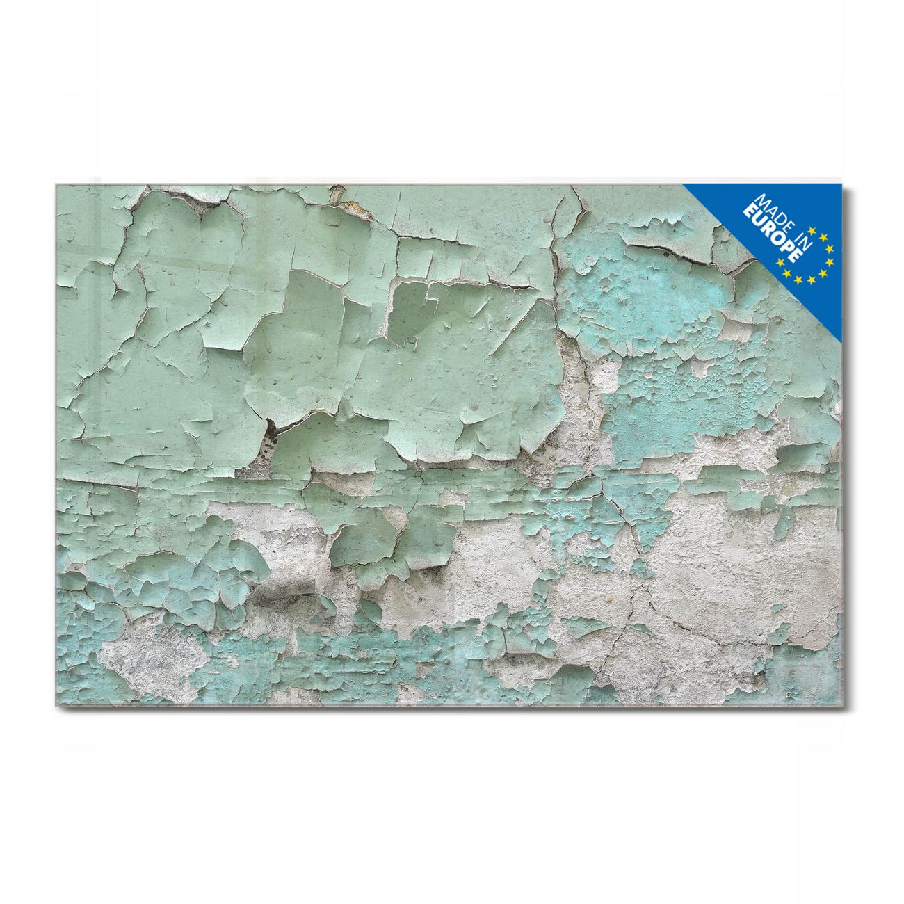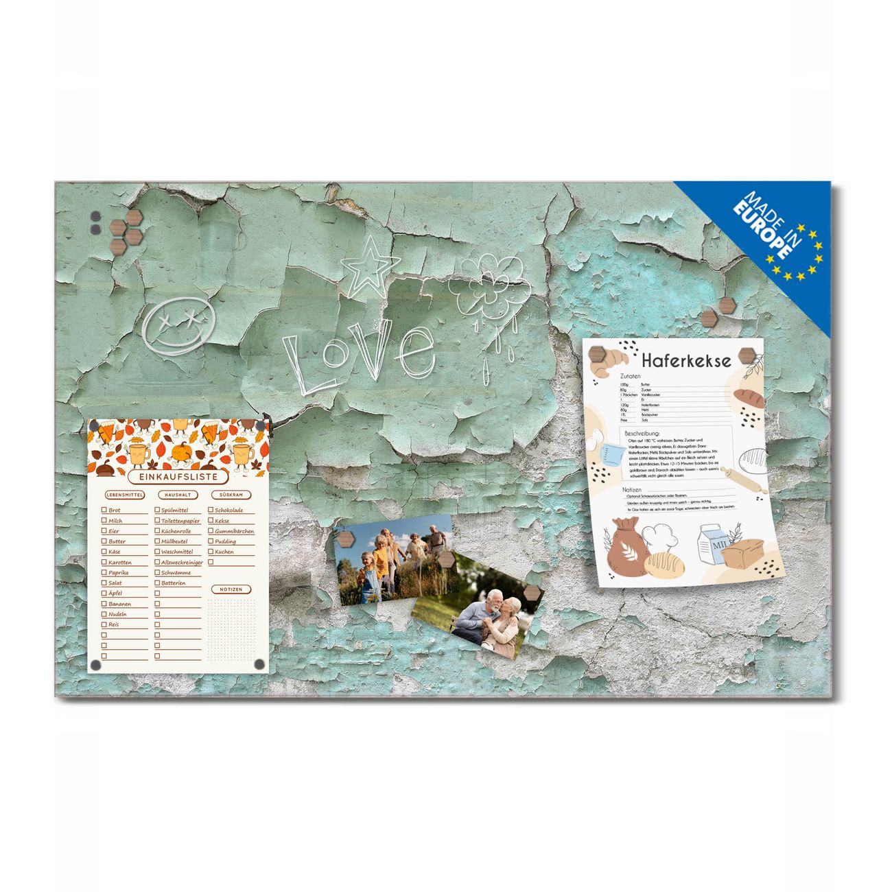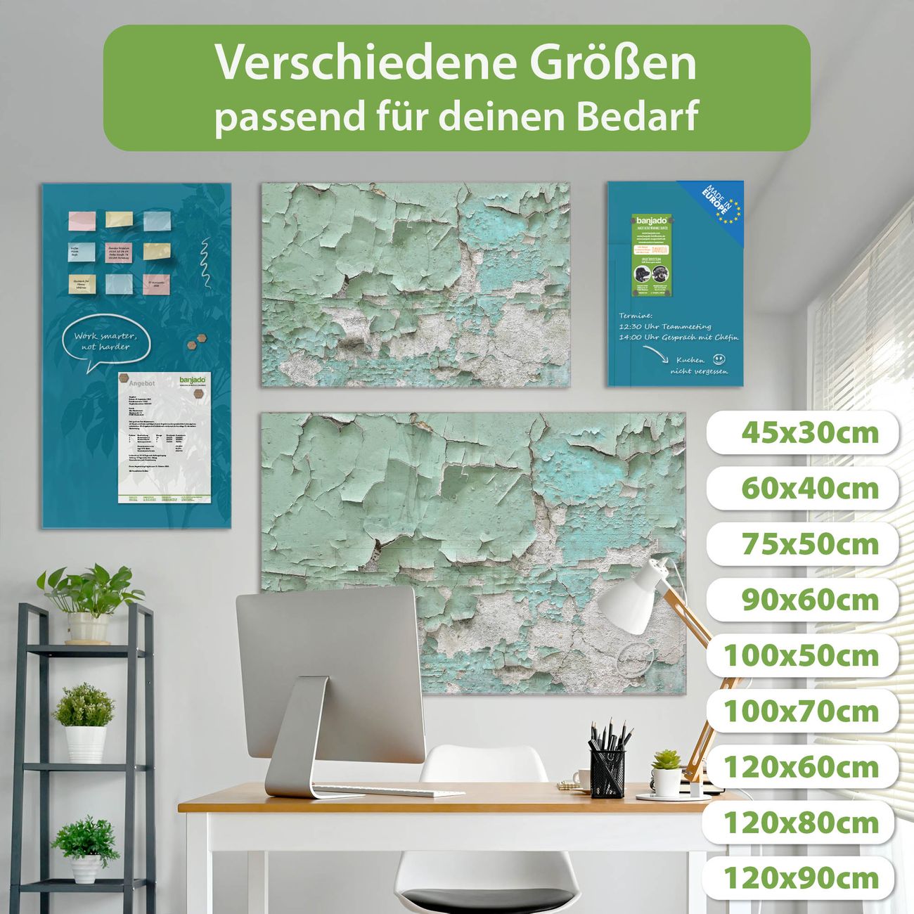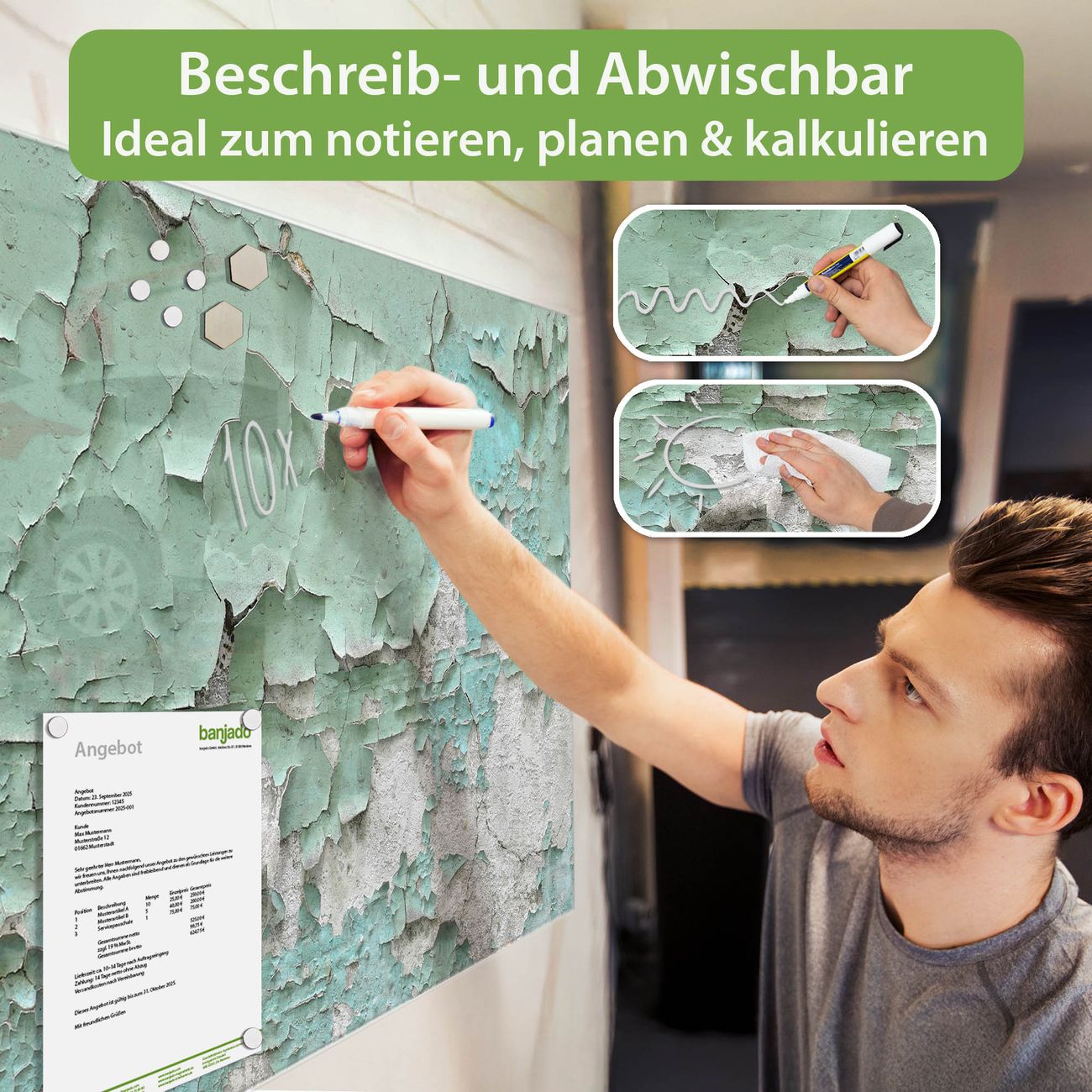 Material: 4mm Sicherheitsglas mit Metallrückwand Eigenschaften: beschreibbar, magnetisch, kratzfest Maße: 75x50x0,6cm, 5,63kg schwer Motiv Nummer 12972 Patina Mint Zubehör: inklusive 4 Neodym-Magnete