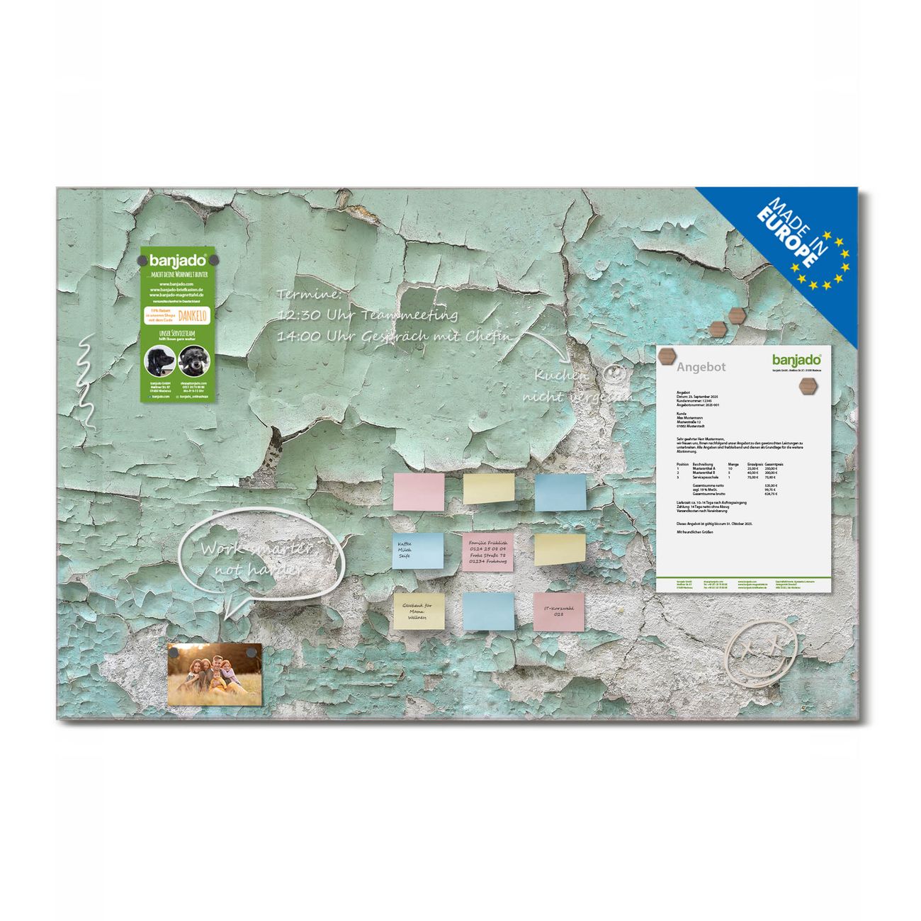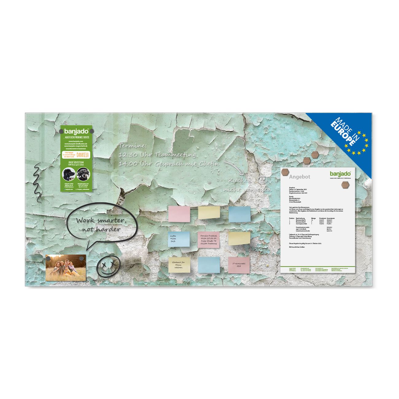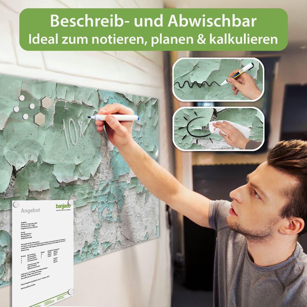 Jede Glas Magnettafel wird in unserer Werkstatt von Hand gefertigt und sorgfältig geprüft. So erhalten Sie ein echtes Qualitätsprodukt, das Funktion und Ästhetik perfekt vereint.?? Warum banjado?