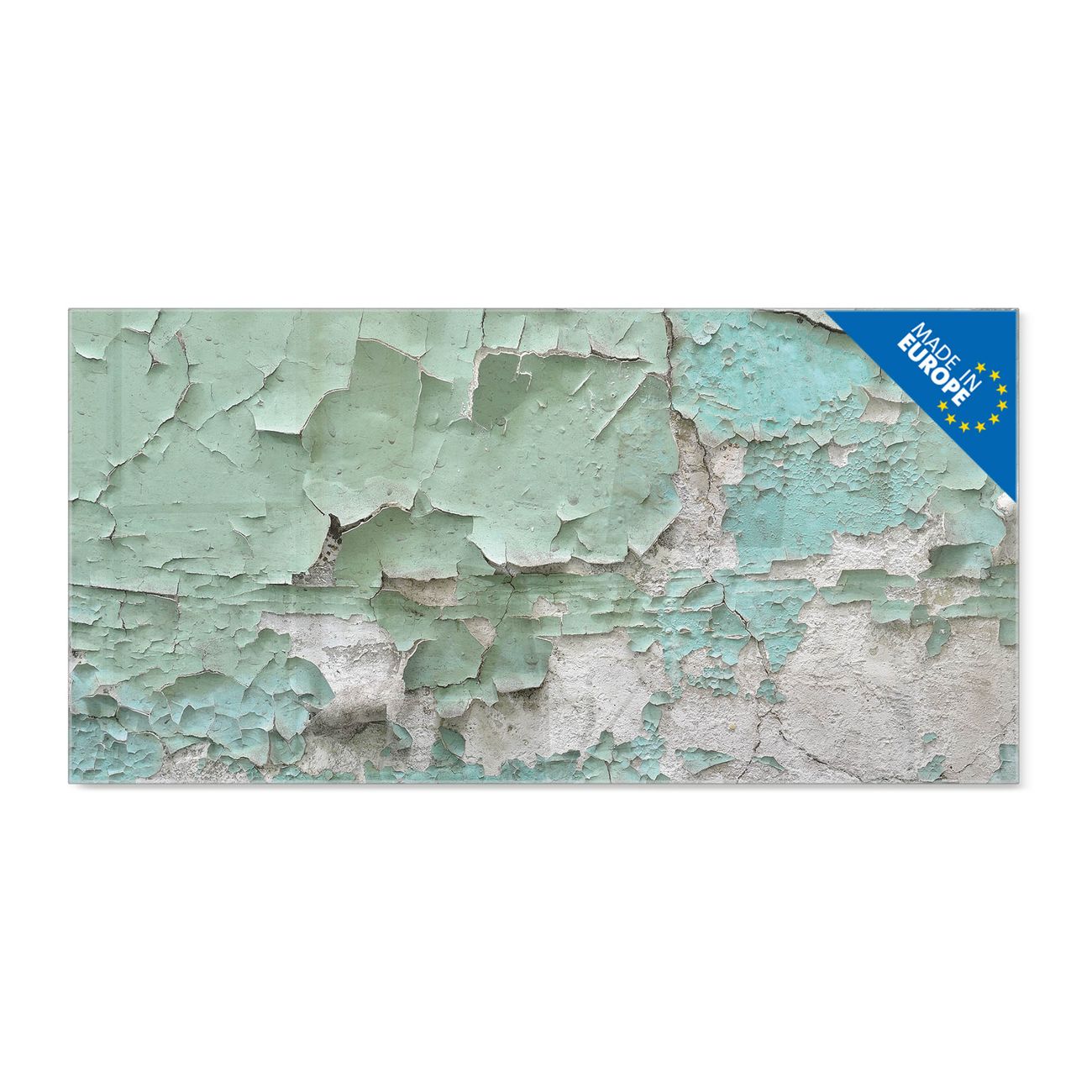 Material: 4mm Sicherheitsglas mit Metallrückwand Eigenschaften: beschreibbar, magnetisch, kratzfest Maße: 120x80x0,6cm, 14,40kg schwer Motiv Nummer 12972 Patina Mint Zubehör: inklusive 4 Neodym-Magnete