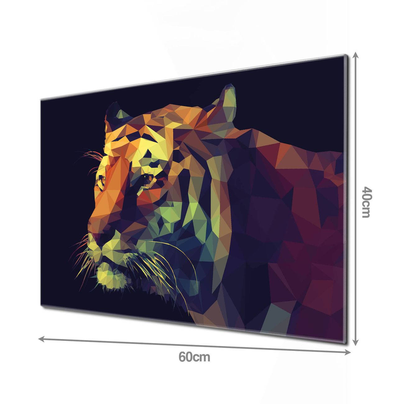 Material: 4mm Sicherheitsglas mit Metallrückwand Eigenschaften: beschreibbar, magnetisch, kratzfest Maße: 60x40x0,6cm, 3,6kg schwer Motiv Nummer 12824 Polygon Tiger Zubehör: inklusive 4 Neodym-Magnete