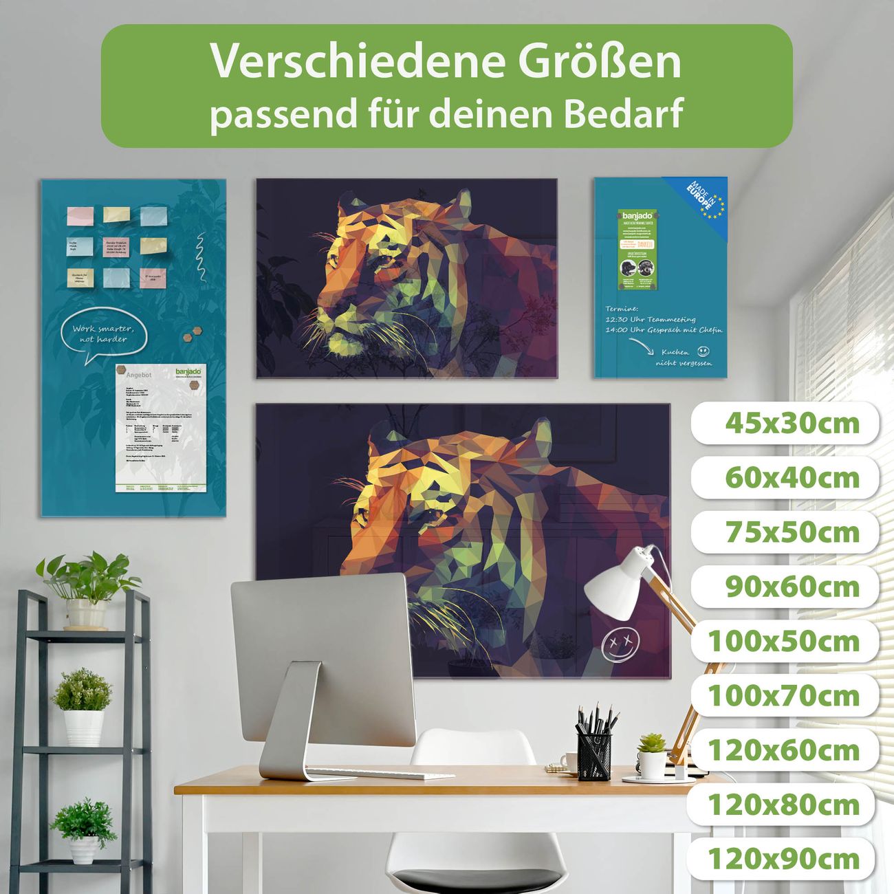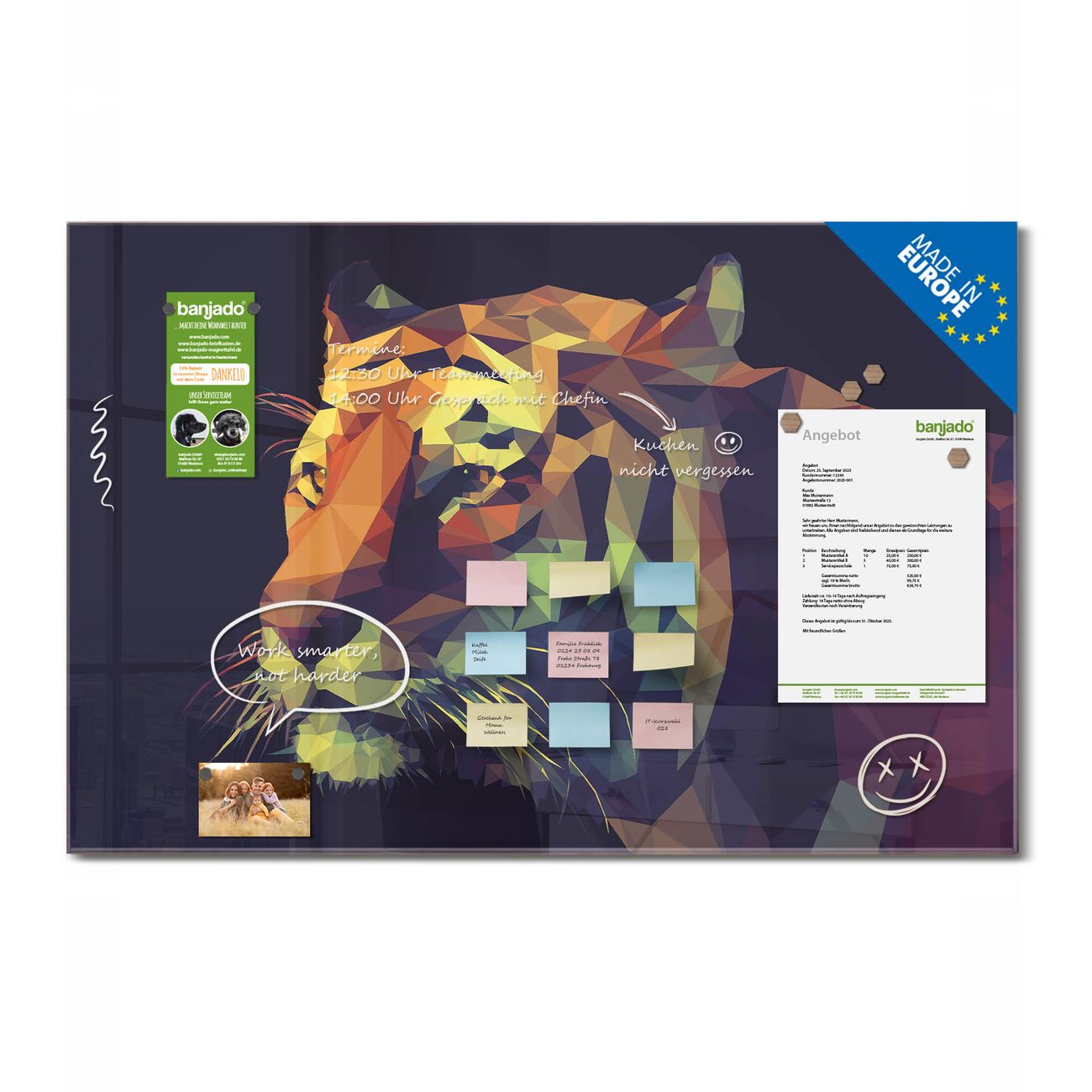 Jede Glas Magnettafel wird in unserer Werkstatt von Hand gefertigt und sorgfältig geprüft. So erhalten Sie ein echtes Qualitätsprodukt, das Funktion und Ästhetik perfekt vereint.?? Warum banjado?