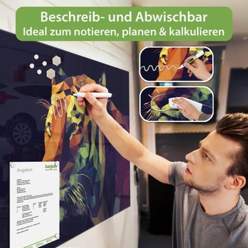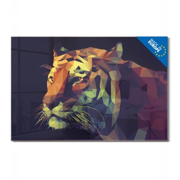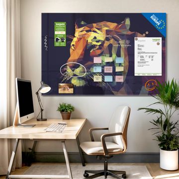 Material: 4mm Sicherheitsglas mit Metallrückwand Eigenschaften: beschreibbar, magnetisch, kratzfest Maße: 90x60x0,6cm, 8,10kg schwer Motiv Nummer 12824 Polygon Tiger Zubehör: inklusive 4 Neodym-Magnete