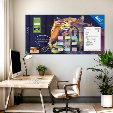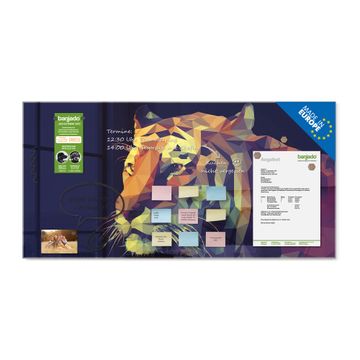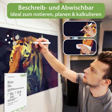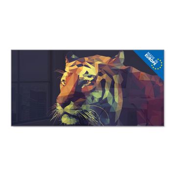 Material: 4mm Sicherheitsglas mit Metallrückwand Eigenschaften: beschreibbar, magnetisch, kratzfest Maße: 120x60x0,6cm, 10,80kg schwer Motiv Nummer 12824 Polygon Tiger Zubehör: inklusive 4 Neodym-Magnete