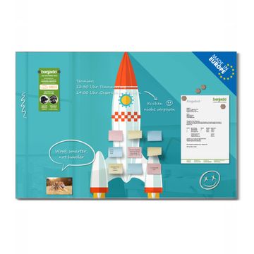 Material: 4mm Sicherheitsglas mit Metallrückwand Eigenschaften: beschreibbar, magnetisch, kratzfest Maße: 120x80x0,6cm, 14,40kg schwer Motiv Nummer 12962 Rakete Zubehör: inklusive 4 Neodym-Magnete