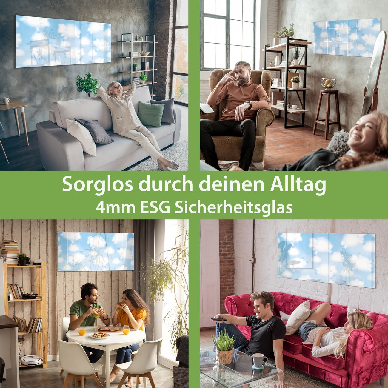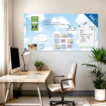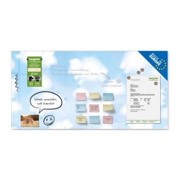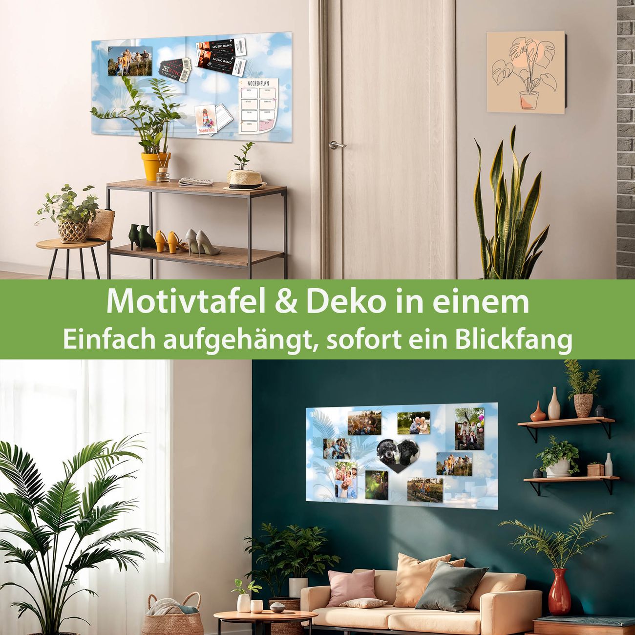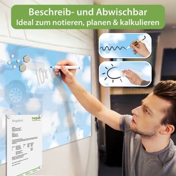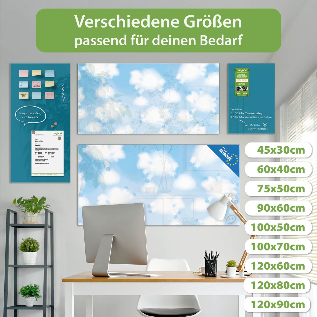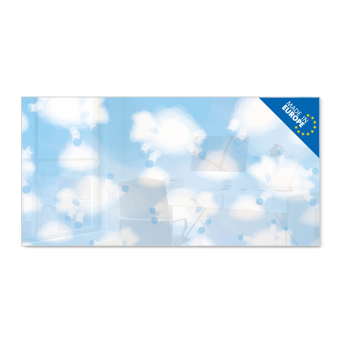 Material: 4mm Sicherheitsglas mit Metallrückwand Eigenschaften: beschreibbar, magnetisch, kratzfest Maße: 100x50x0,6cm, 7,50kg schwer Motiv Nummer 12841 Schäfchenwolken Zubehör: inklusive 4 Neodym-Magnete