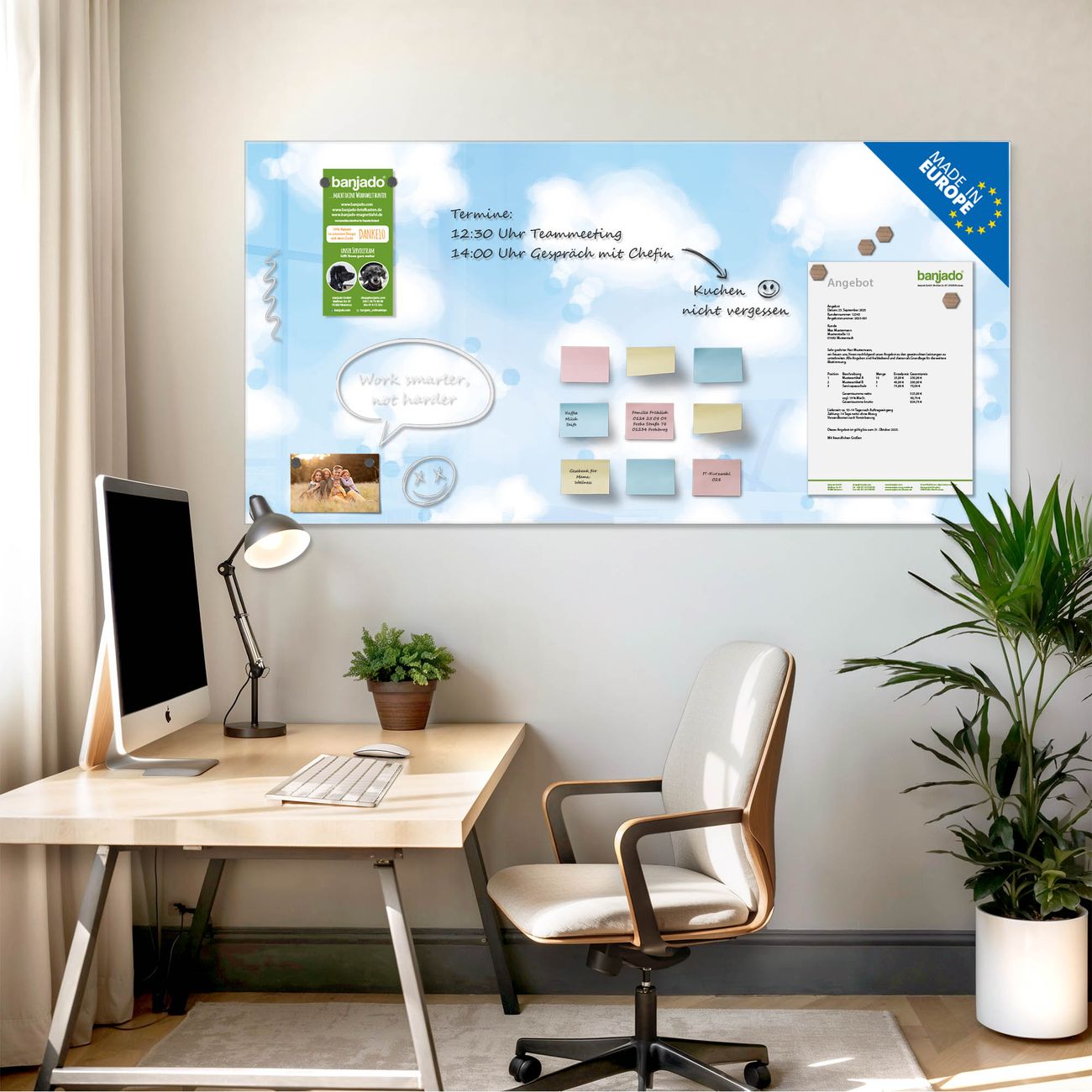 Die banjado Glas Magnettafel mit dem Motiv Motiv Schäfchenwolken verbindet Funktionalität mit Stil. Sie ersetzt das Zettelchaos durch klare Strukturen und bringt dabei eine warme, natürliche Atmosphäre in Ihr Zuhause. Ob im Büro, in der Küche oder im Eingangsbereich - dieses Design-Board zieht Blicke an und sorgt für Ordnung mit Charakter.