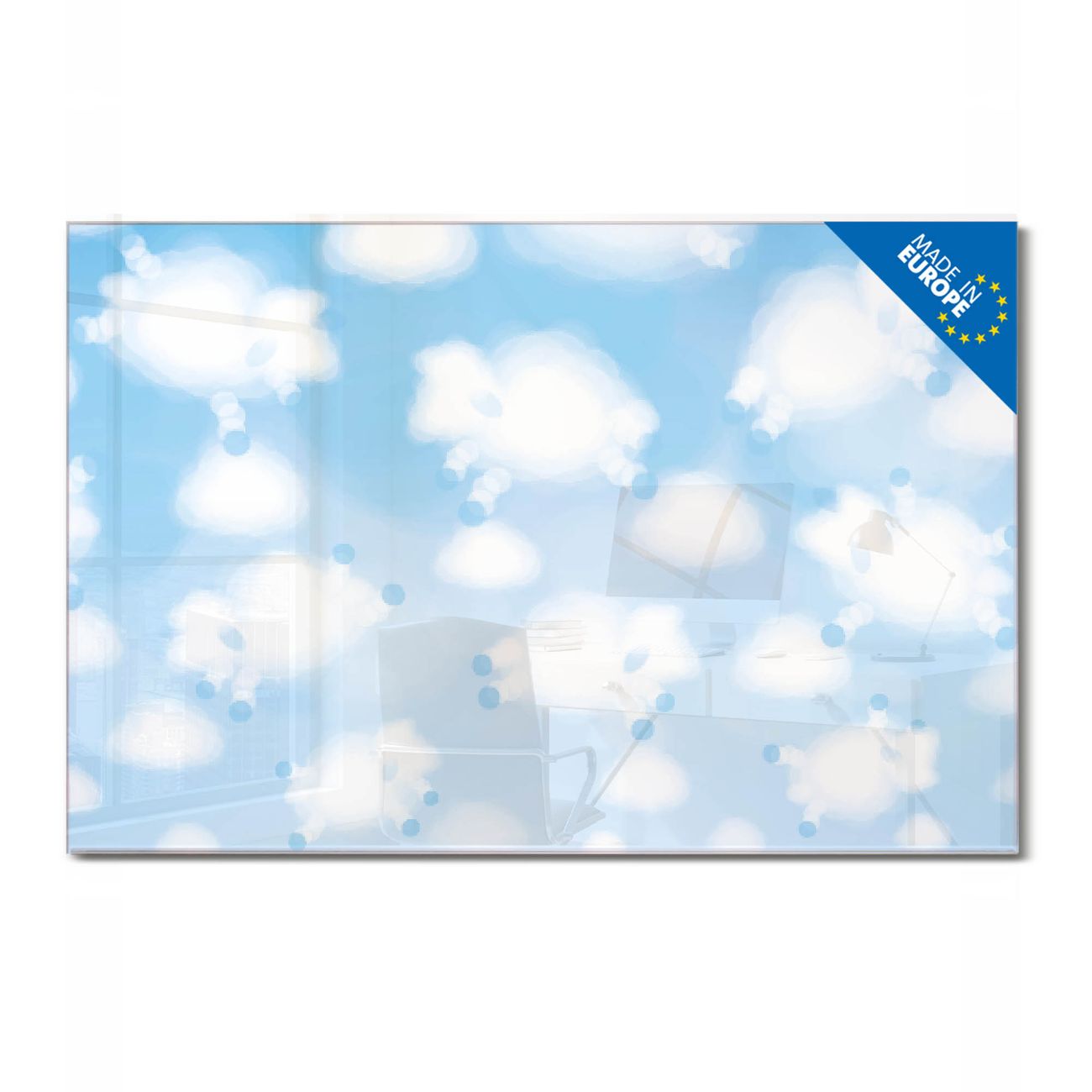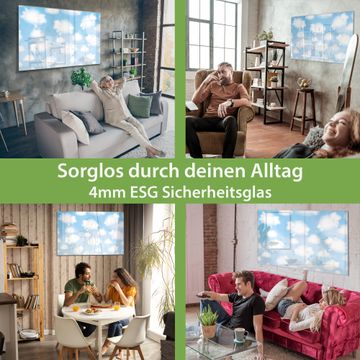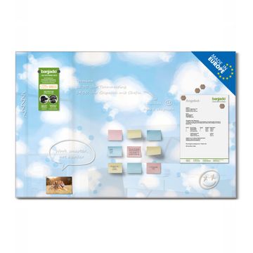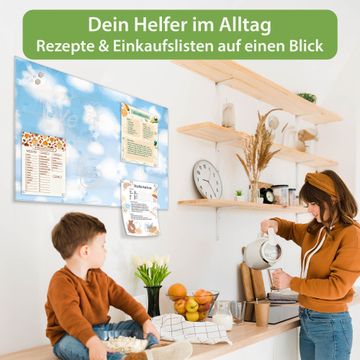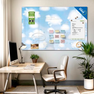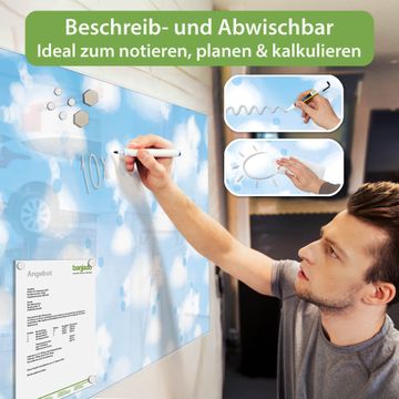 Material: 4mm Sicherheitsglas mit Metallrückwand Eigenschaften: beschreibbar, magnetisch, kratzfest Maße: 120x80x0,6cm, 14,40kg schwer Motiv Nummer 12841 Schäfchenwolken Zubehör: inklusive 4 Neodym-Magnete