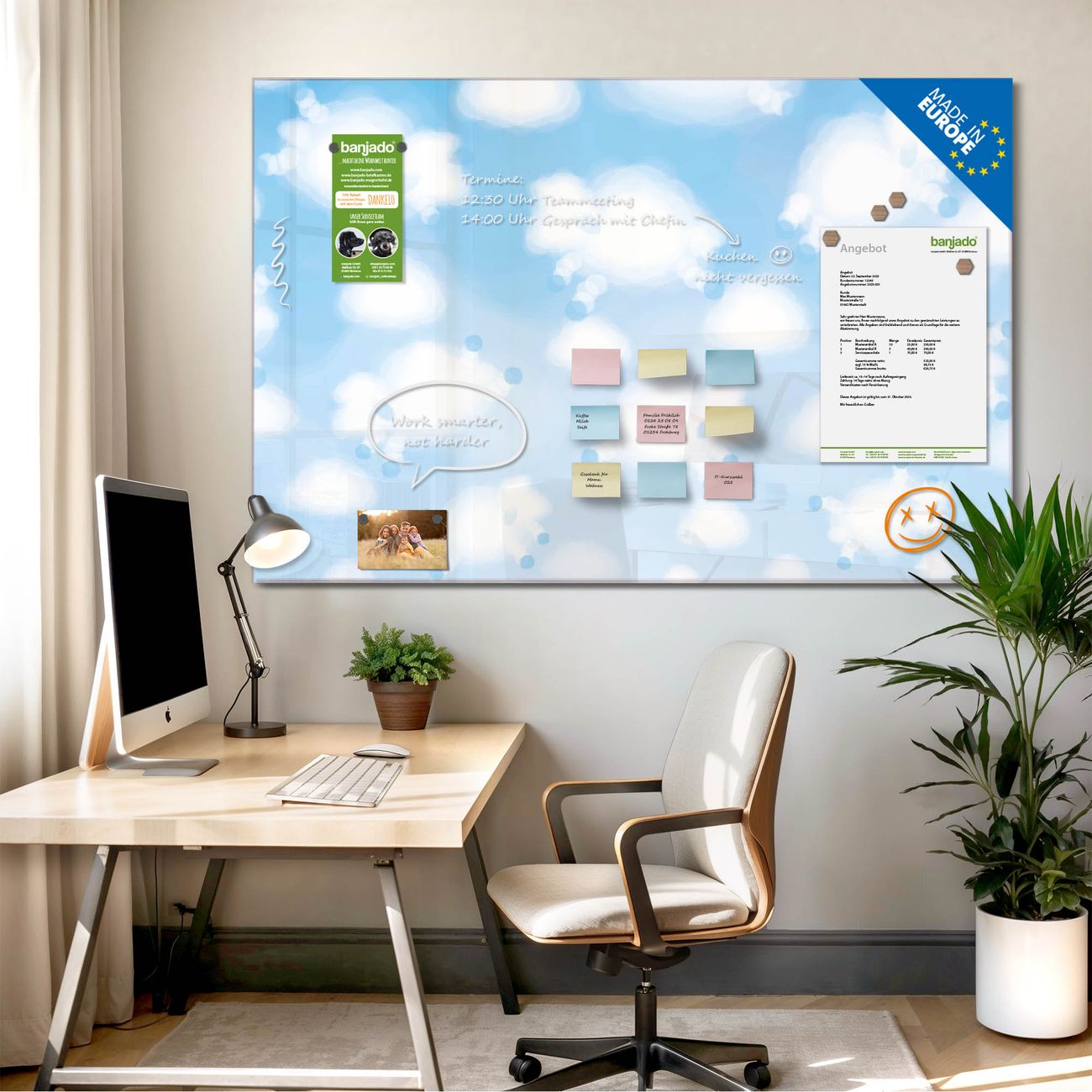 Jede Glas Magnettafel wird in unserer Werkstatt von Hand gefertigt und sorgfältig geprüft. So erhalten Sie ein echtes Qualitätsprodukt, das Funktion und Ästhetik perfekt vereint.?? Warum banjado?