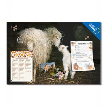 Material: 4mm Sicherheitsglas mit Metallrückwand Eigenschaften: beschreibbar, magnetisch, kratzfest Maße: 75x50x0,6cm, 5,63kg schwer Motiv Nummer 12806 Schaf Und Lamm Zubehör: inklusive 4 Neodym-Magnete