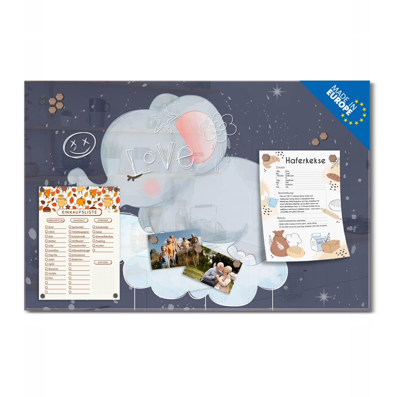 Material: 4mm Sicherheitsglas mit Metallrückwand Eigenschaften: beschreibbar, magnetisch, kratzfest Maße: 75x50x0,6cm, 5,63kg schwer Motiv Nummer 12859 schlafender Elefant Zubehör: inklusive 4 Neodym-Magnete