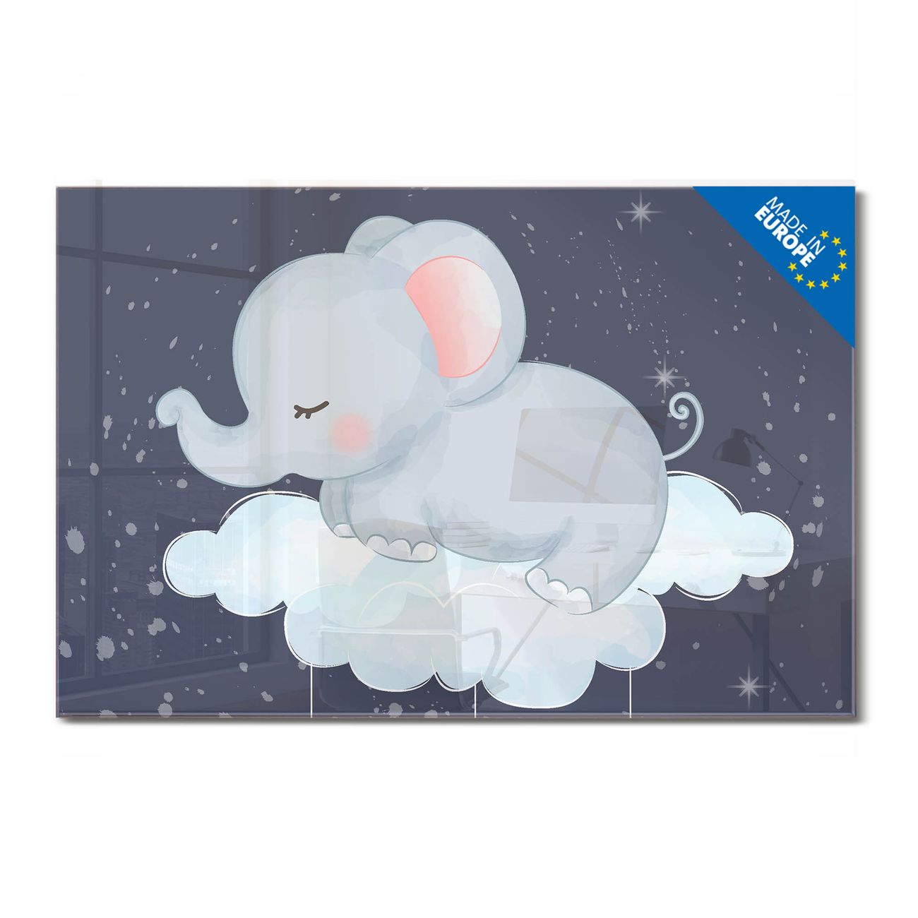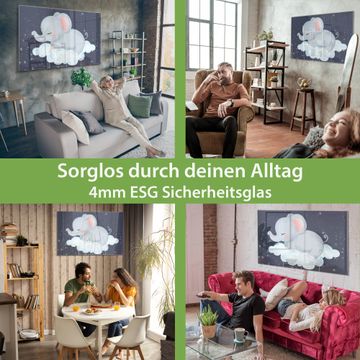 Material: 4mm Sicherheitsglas mit Metallrückwand Eigenschaften: beschreibbar, magnetisch, kratzfest Maße: 120x80x0,6cm, 14,40kg schwer Motiv Nummer 12859 schlafender Elefant Zubehör: inklusive 4 Neodym-Magnete