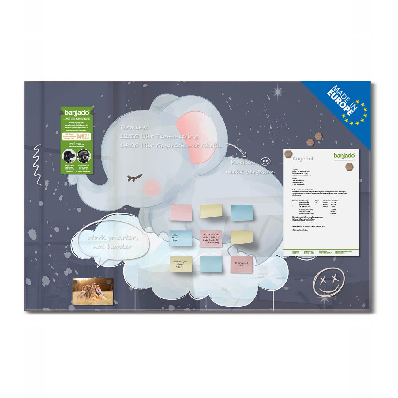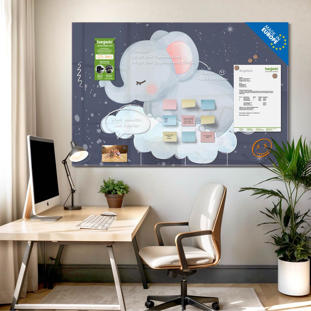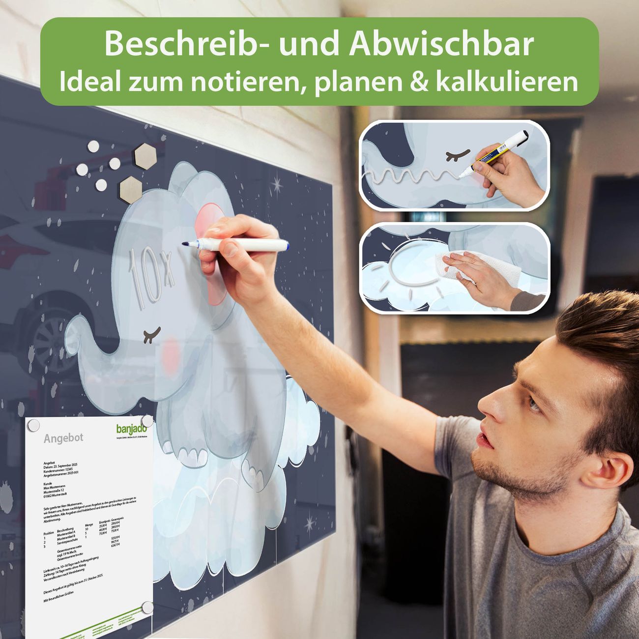 Jede Glas Magnettafel wird in unserer Werkstatt von Hand gefertigt und sorgfältig geprüft. So erhalten Sie ein echtes Qualitätsprodukt, das Funktion und Ästhetik perfekt vereint.?? Warum banjado?