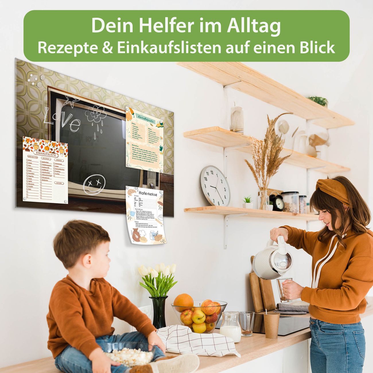 Auf der glatten Glasoberfläche lassen sich Termine, Rezepte oder Notizen ganz einfach mit Kreidestiften festhalten und rückstandslos entfernen. Starke Neodym-Magnete halten Ihre wichtigsten Erinnerungen sicher an Ort und Stelle. So entsteht Ihre ganz persönliche Ideenwand - jeden Tag neu.