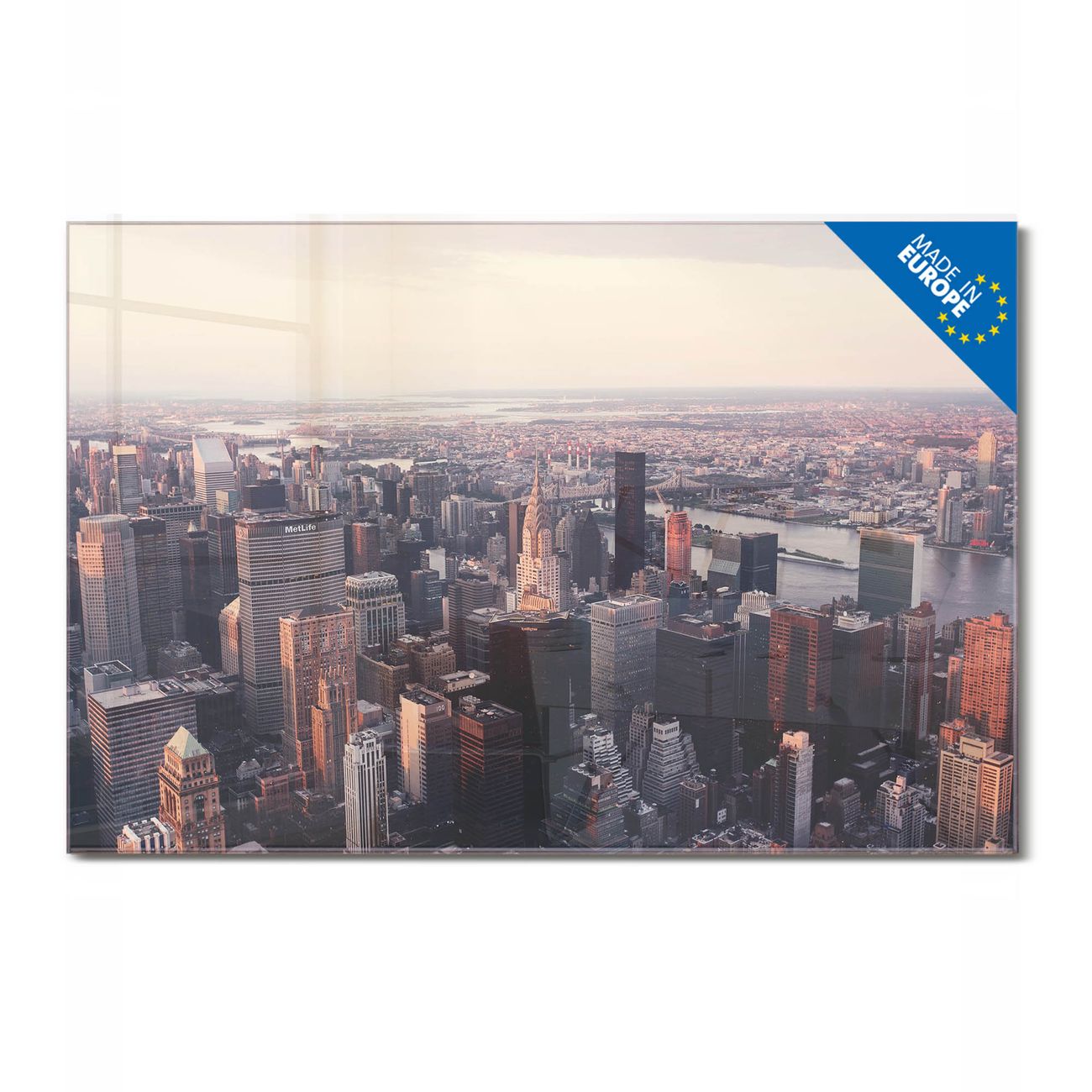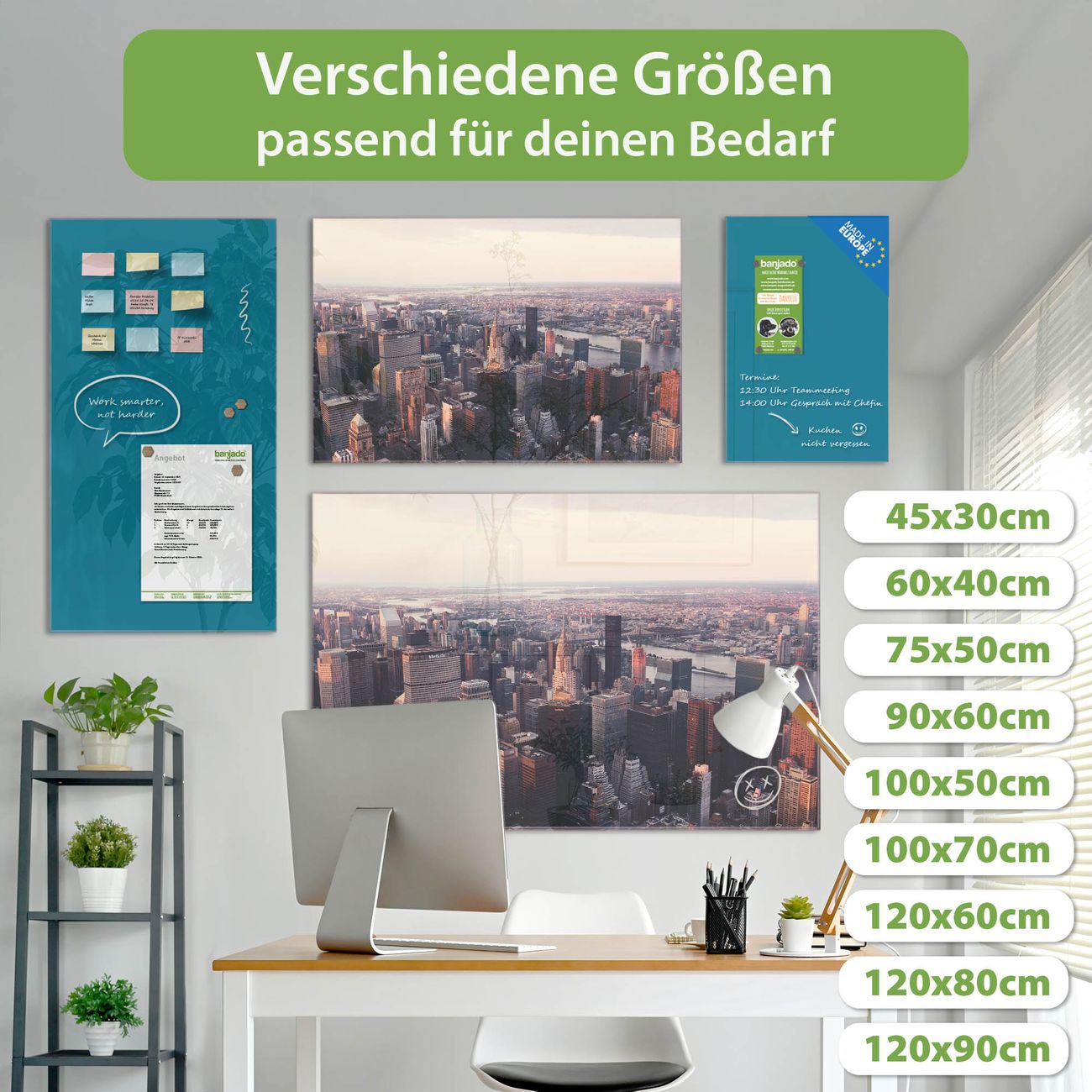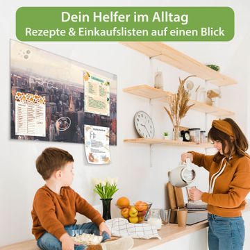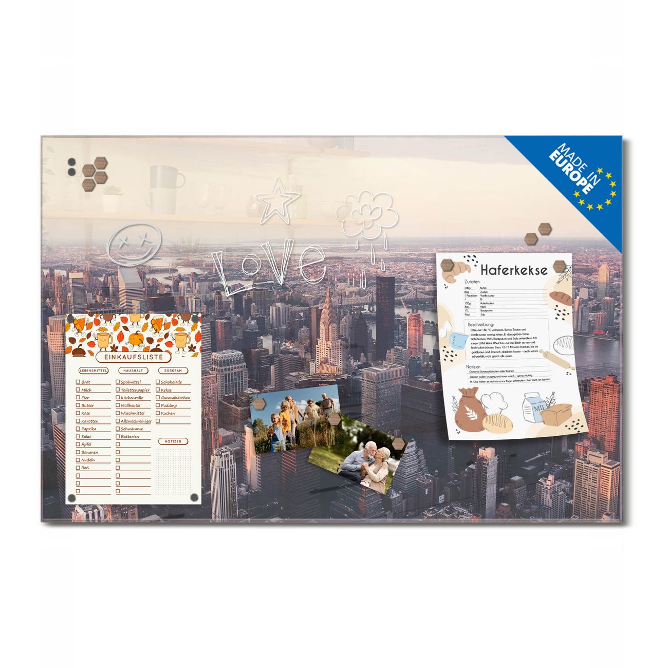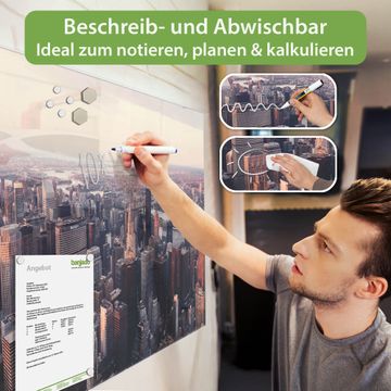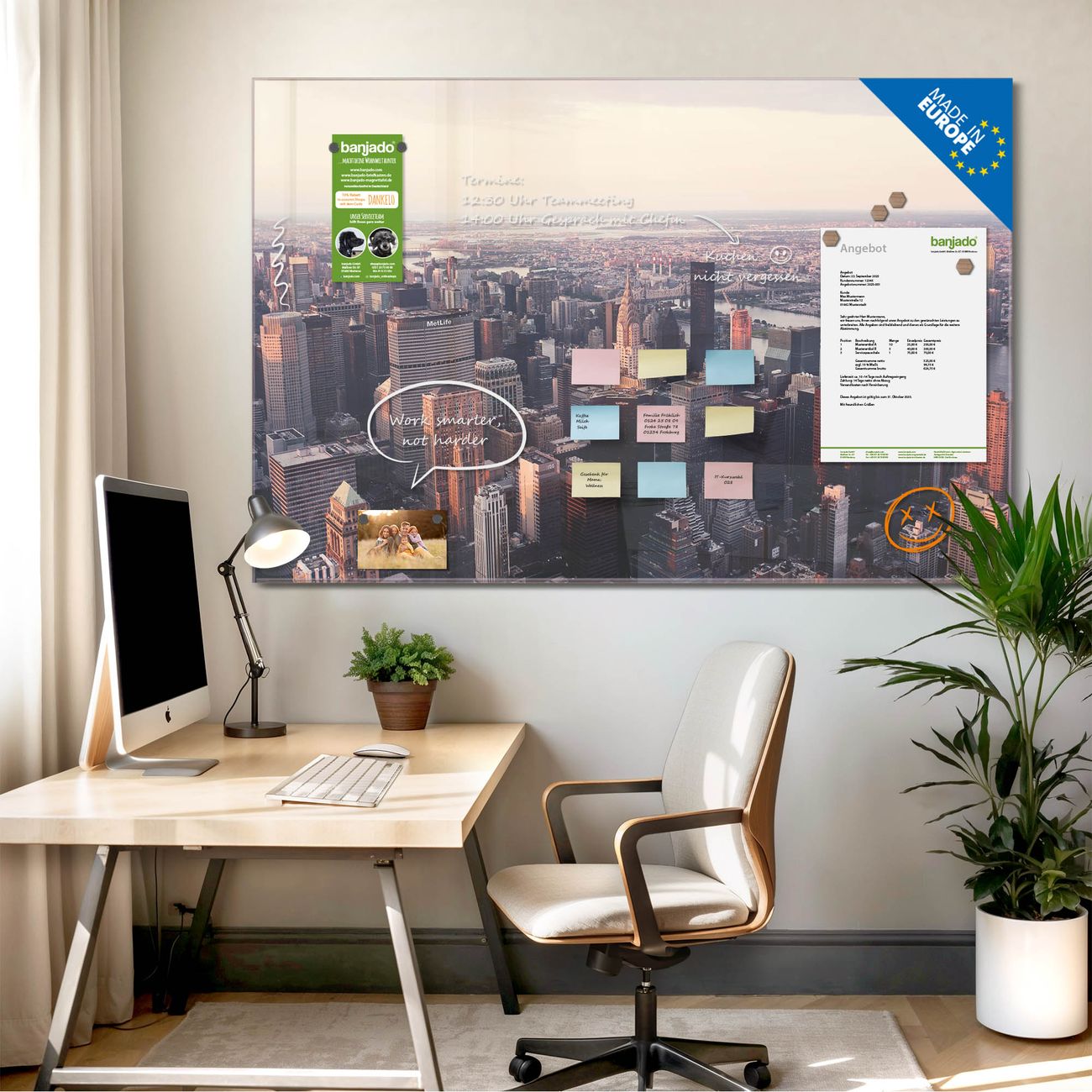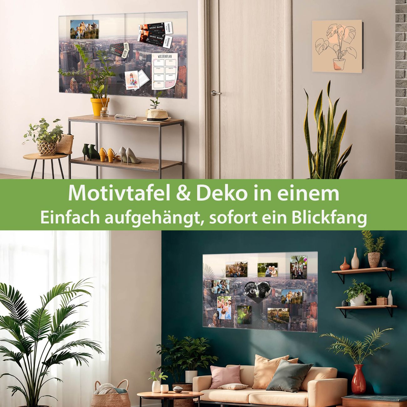 Material: 4mm Sicherheitsglas mit Metallrückwand Eigenschaften: beschreibbar, magnetisch, kratzfest Maße: 75x50x0,6cm, 5,63kg schwer Motiv Nummer 12993 Skyline Zubehör: inklusive 4 Neodym-Magnete