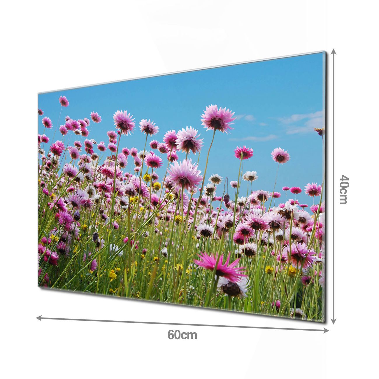 Material: 4mm Sicherheitsglas mit Metallrückwand Eigenschaften: beschreibbar, magnetisch, kratzfest Maße: 60x40x0,6cm, 3,6kg schwer Motiv Nummer 10464 Sommerblumen Zubehör: inklusive 4 Neodym-Magnete