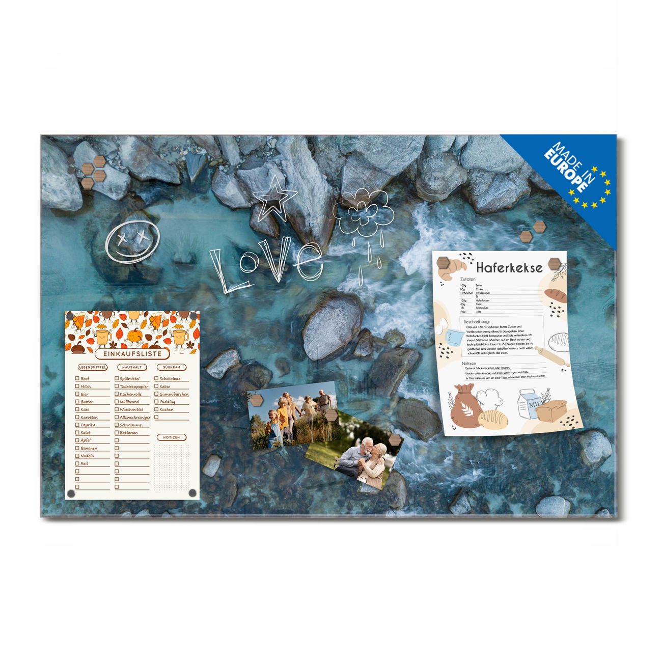 Auf der glatten Glasoberfläche lassen sich Termine, Rezepte oder Notizen ganz einfach mit Kreidestiften festhalten und rückstandslos entfernen. Starke Neodym-Magnete halten Ihre wichtigsten Erinnerungen sicher an Ort und Stelle. So entsteht Ihre ganz persönliche Ideenwand - jeden Tag neu.