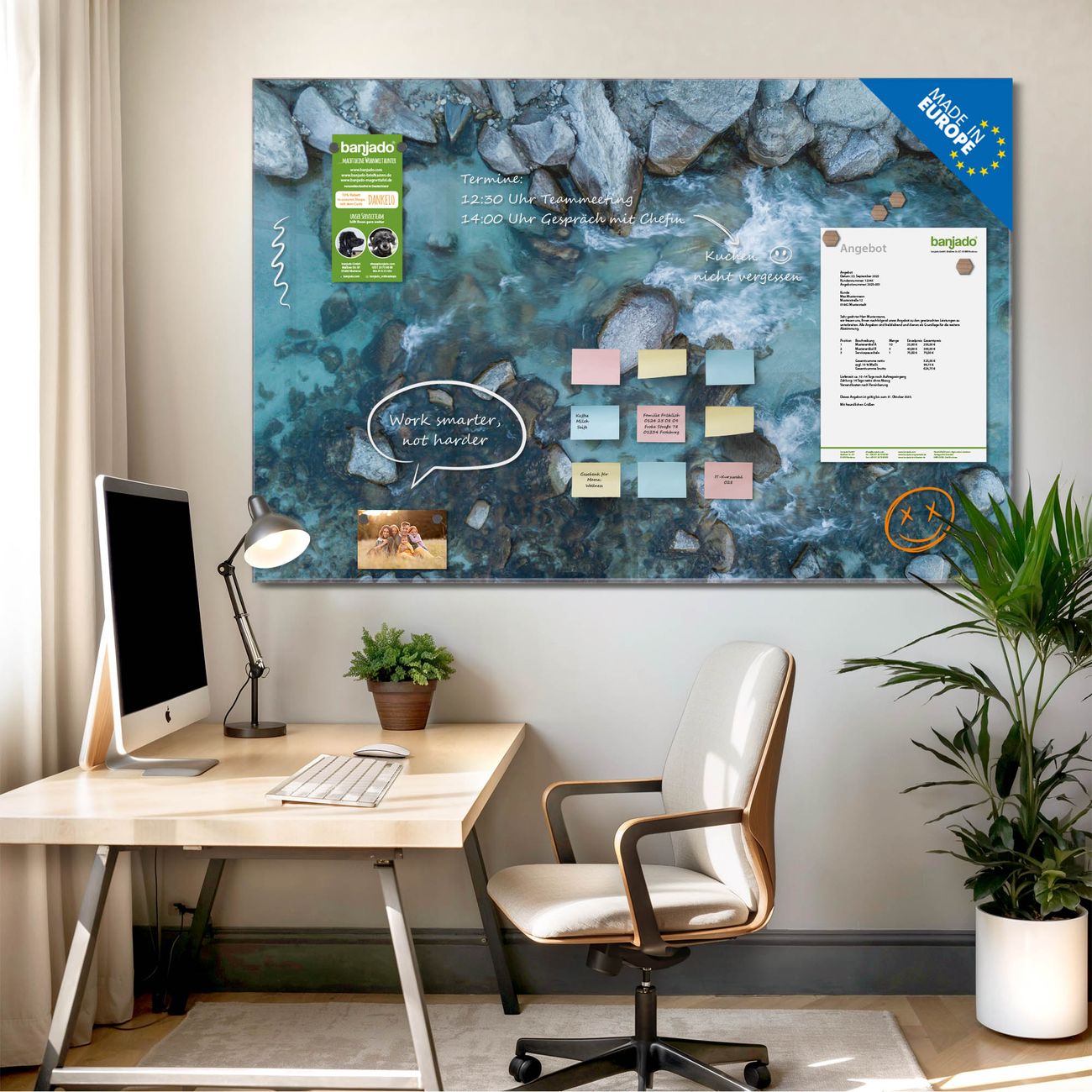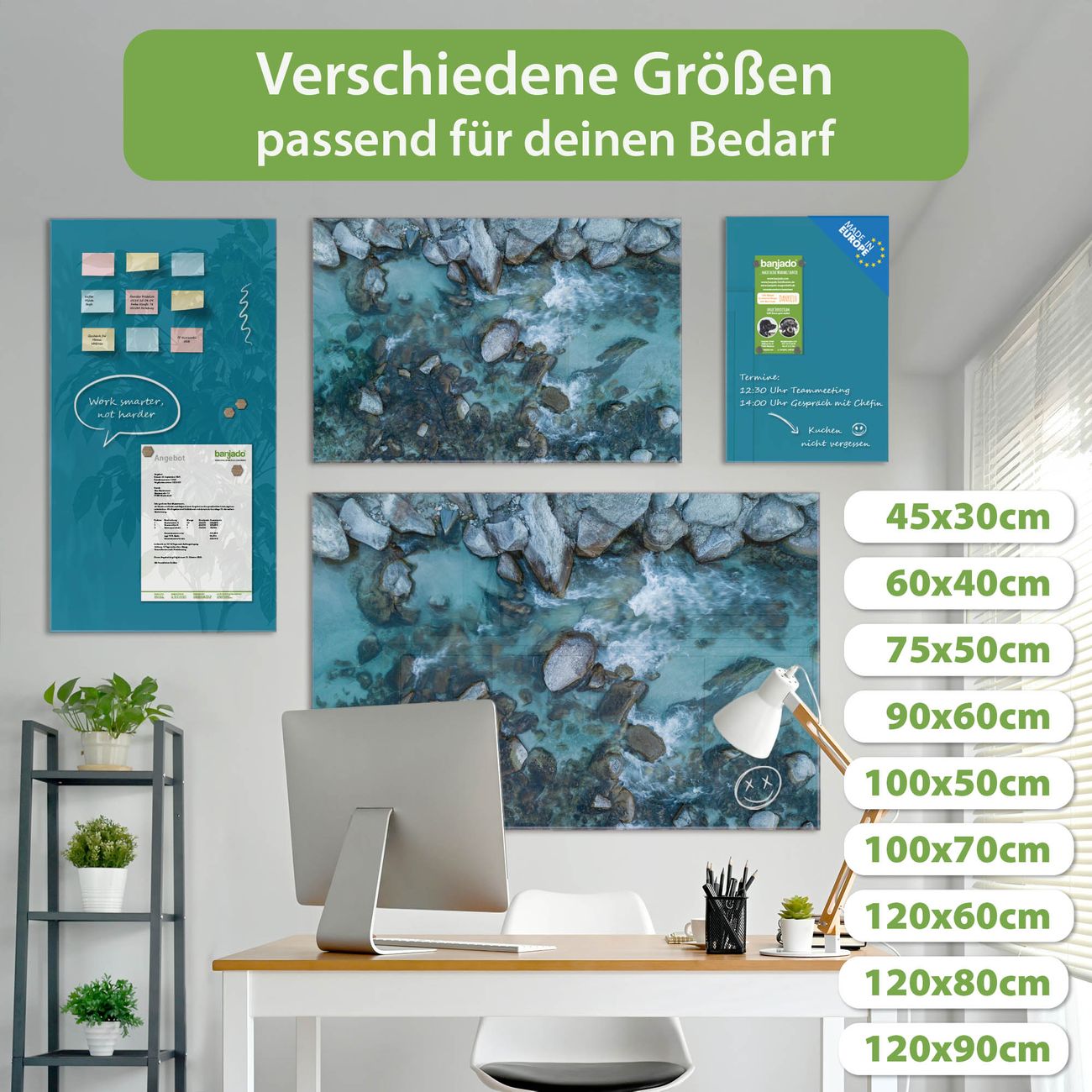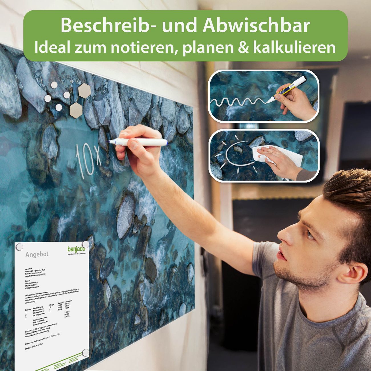 Jede Glas Magnettafel wird in unserer Werkstatt von Hand gefertigt und sorgfältig geprüft. So erhalten Sie ein echtes Qualitätsprodukt, das Funktion und Ästhetik perfekt vereint.?? Warum banjado?