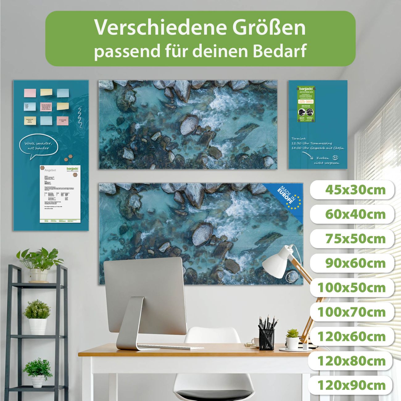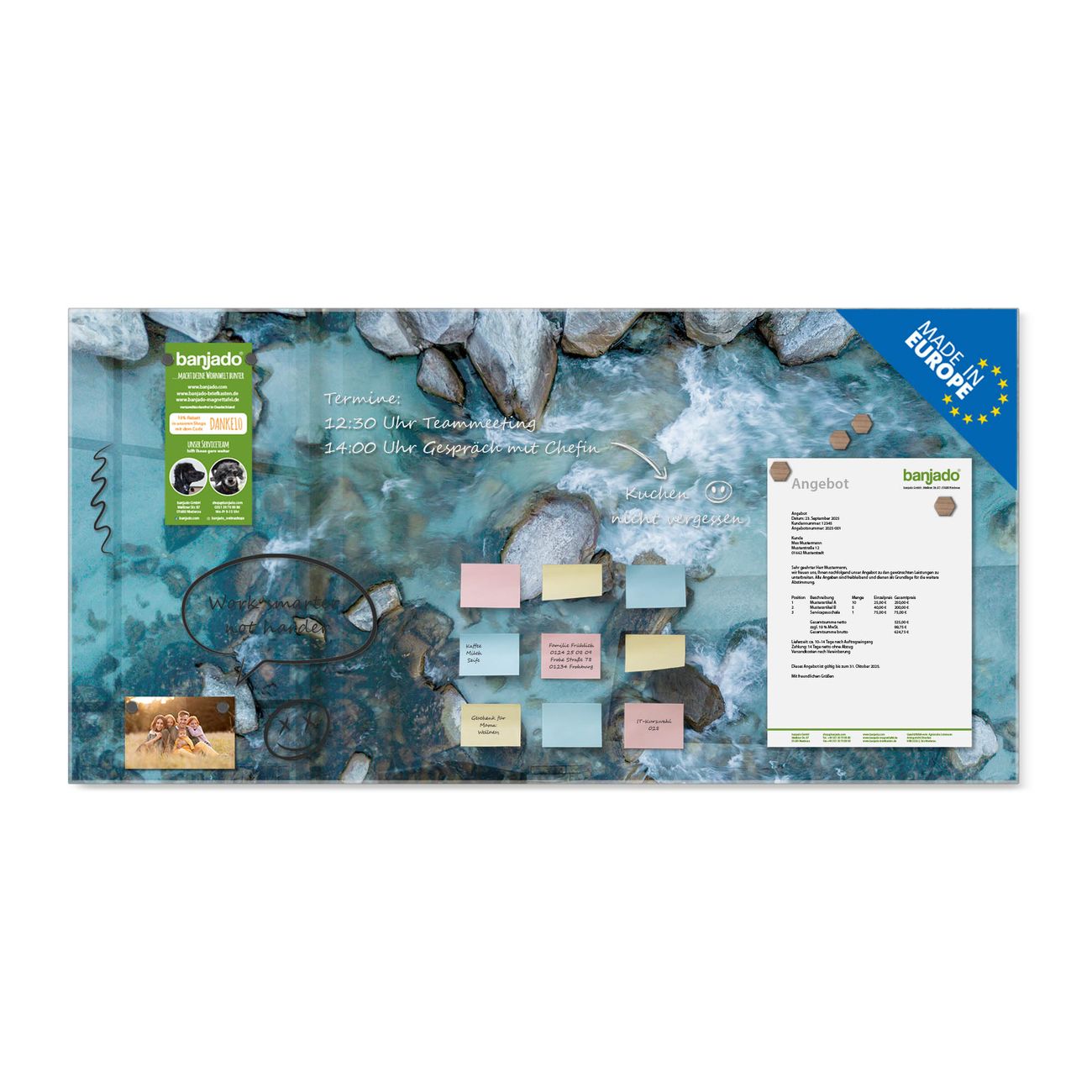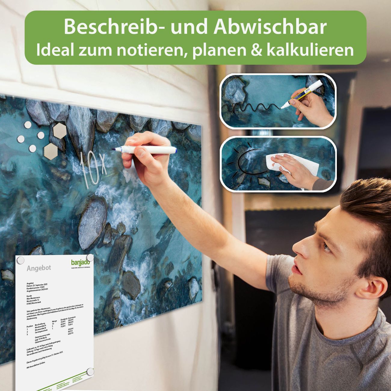 Jede Glas Magnettafel wird in unserer Werkstatt von Hand gefertigt und sorgfältig geprüft. So erhalten Sie ein echtes Qualitätsprodukt, das Funktion und Ästhetik perfekt vereint.?? Warum banjado?