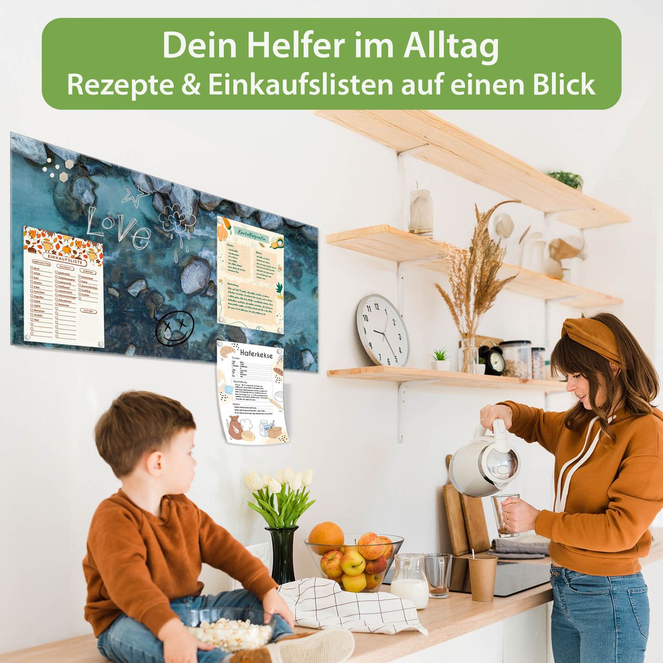 Auf der glatten Glasoberfläche lassen sich Termine, Rezepte oder Notizen ganz einfach mit Kreidestiften festhalten und rückstandslos entfernen. Starke Neodym-Magnete halten Ihre wichtigsten Erinnerungen sicher an Ort und Stelle. So entsteht Ihre ganz persönliche Ideenwand - jeden Tag neu.