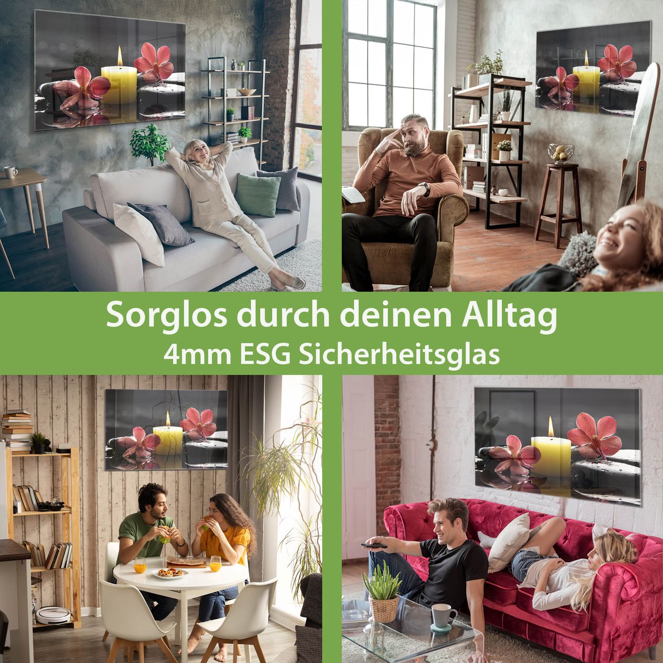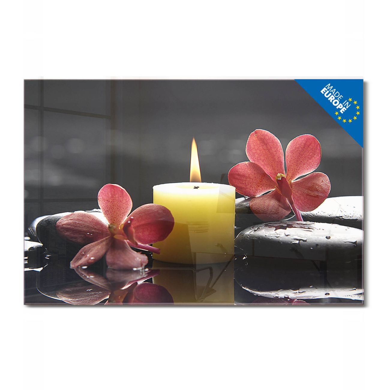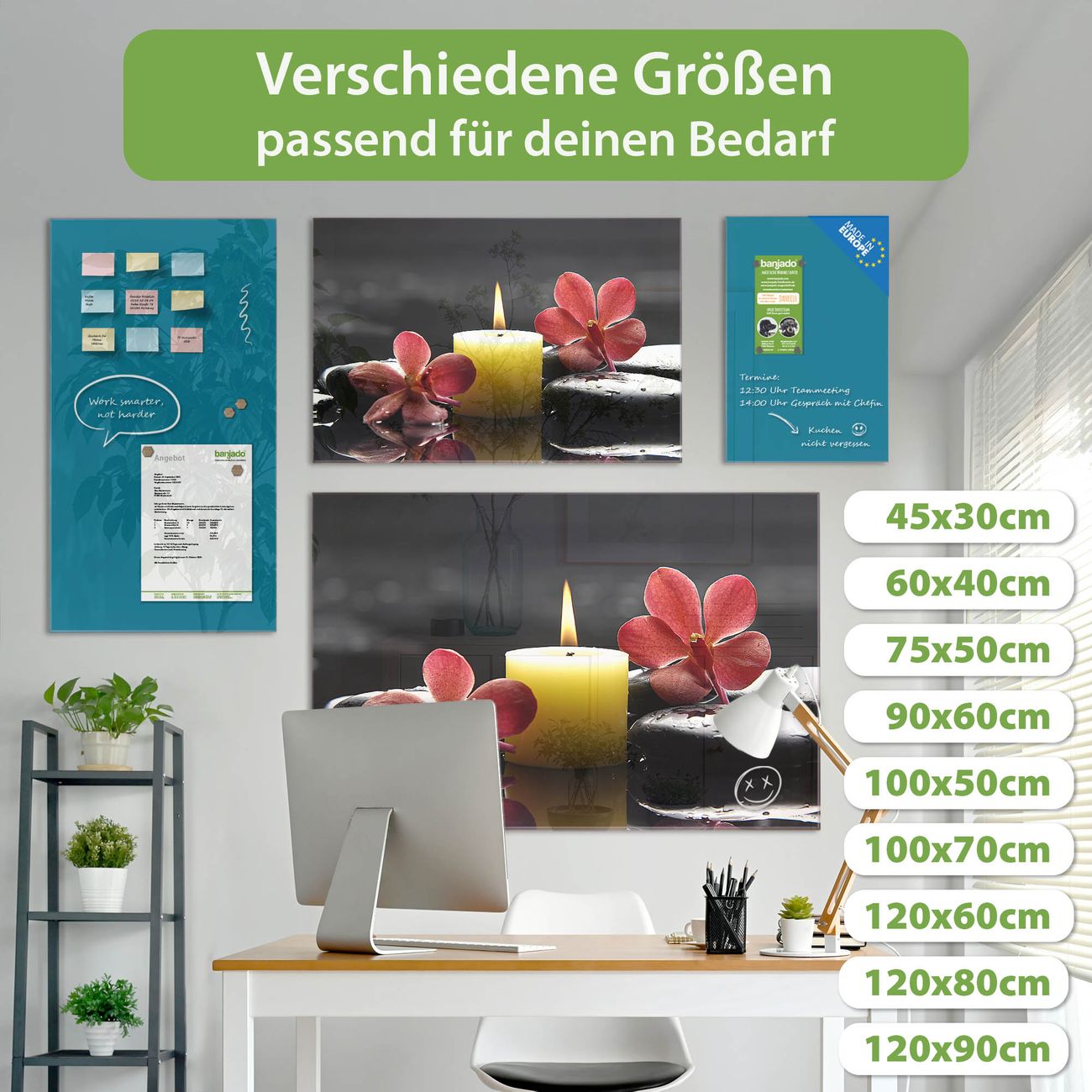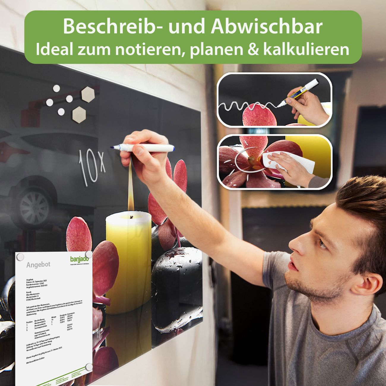 Material: 4mm Sicherheitsglas mit Metallrückwand Eigenschaften: beschreibbar, magnetisch, kratzfest Maße: 120x80x0,6cm, 14,40kg schwer Motiv Nummer 12821 Steine & Relax 5 Zubehör: inklusive 4 Neodym-Magnete