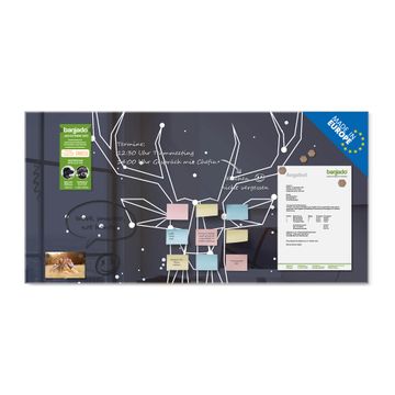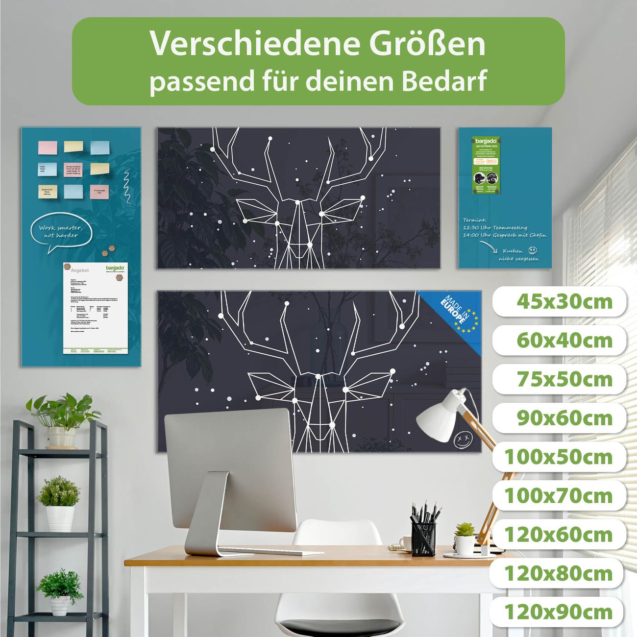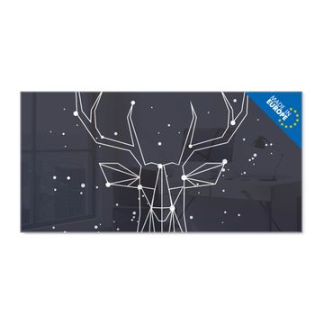 Material: 4mm Sicherheitsglas mit Metallrückwand Eigenschaften: beschreibbar, magnetisch, kratzfest Maße: 100x50x0,6cm, 7,50kg schwer Motiv Nummer 12854 Sternbild Hirsch Zubehör: inklusive 4 Neodym-Magnete