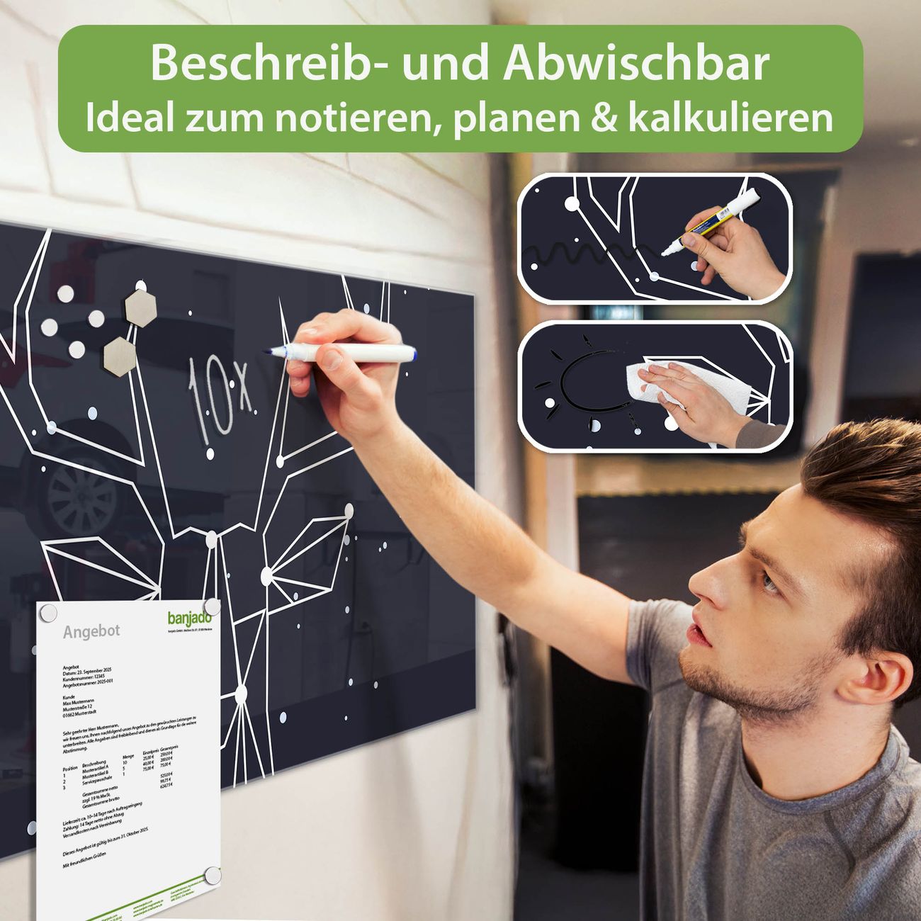 Bitte beachten Sie, dass ausschliessliche spezielle Magnete an der Glastafel haften. Wir empfehlen banjado Neodym Magnete, diese sind durch uns auf Wirksamkeit geprüft.